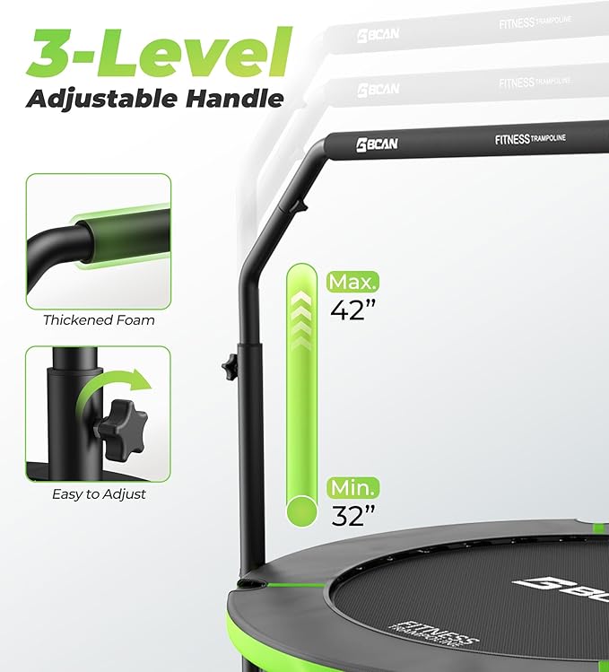- 3-Level Adjustable Handle: Handle height available from 32'' to 42''. BCAN Rebounder Trampoline for Adults can be adjusted to the height range, ensuring that you can hold the handlebar in the most comfortable position when jumping