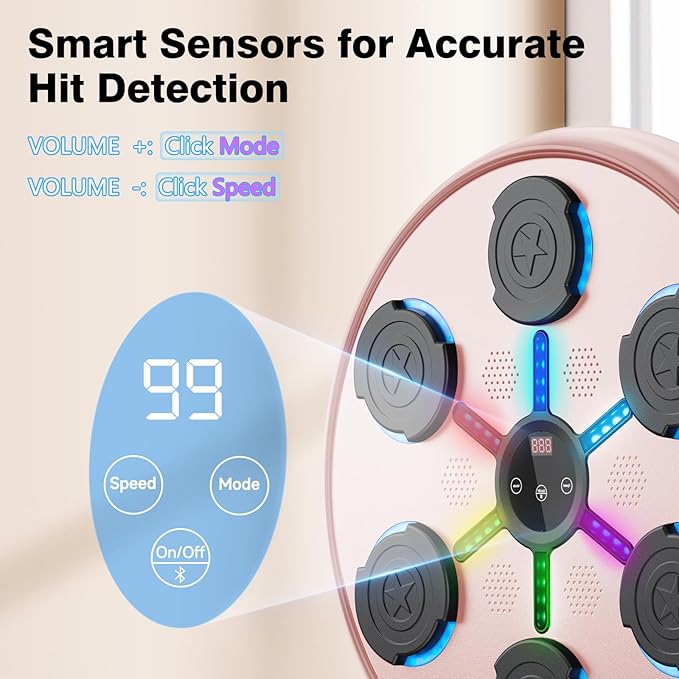 - Smart Tracking and Personalized Workouts: With 9 speeds and 9 punching modes, the Music Boxing Machine is controlled via a smart touch screen. Each punch triggers an LED light, showing your score and accuracy, while tracking every punch and providing real-time feedback. You can also connect via Bluetooth to sync your favorite music rhythm to the workout, making it more engaging and motivating—perfect for women and girls