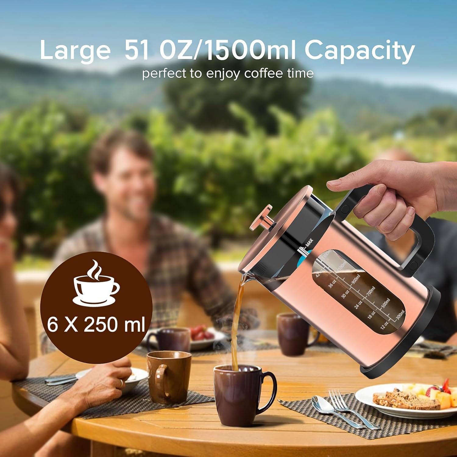 QUQIYSO French Press Coffee Maker 51oz 304 Stainless Steel French Press with 4 Filter, Borosilicate Glass Coffee Press