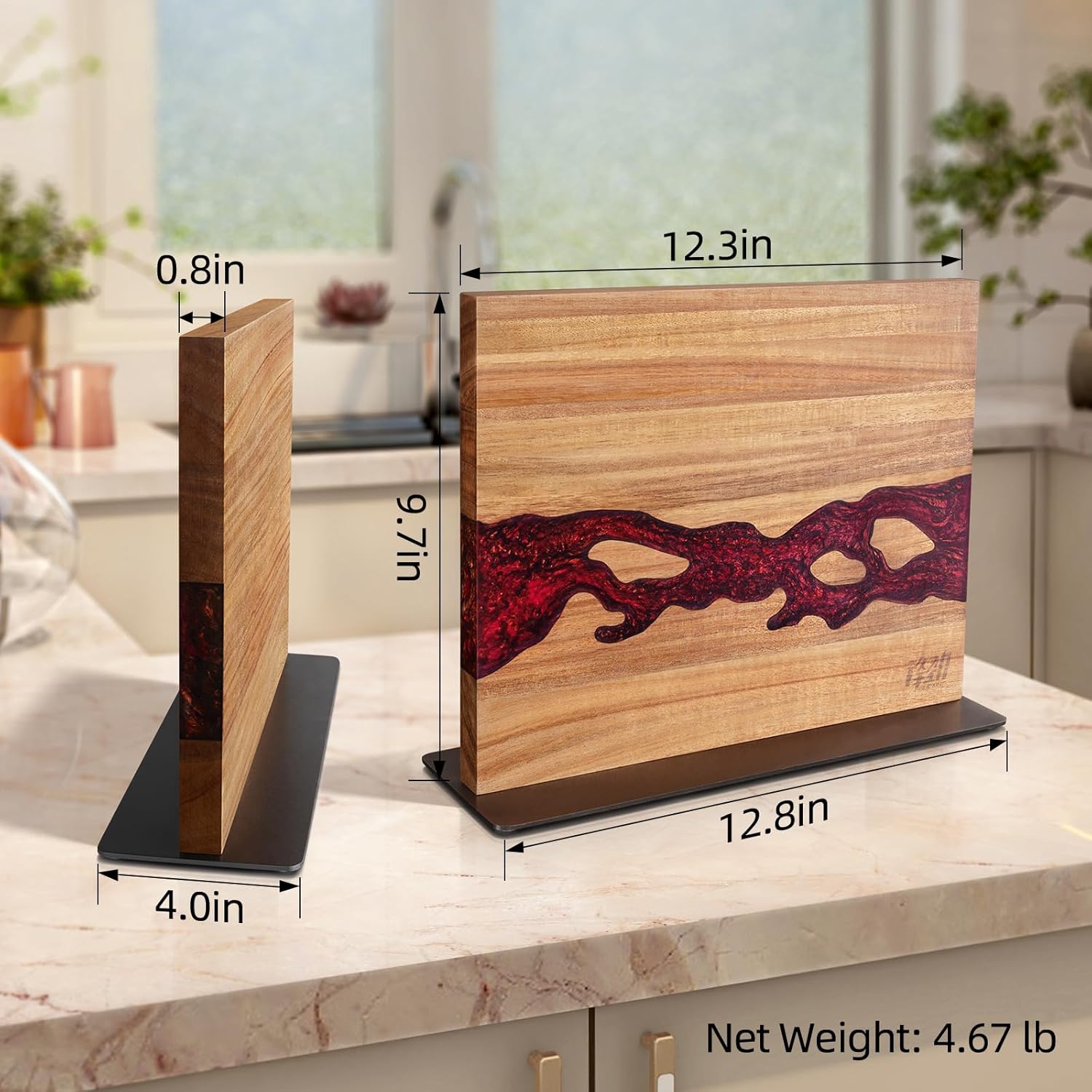 FINDKING Magnetic Knife Block, Double Sided Holder, Powerful Magnet Kitchen Storage, Acacia Wood and Red Resin (12 x 10 Inches, Without Knives)