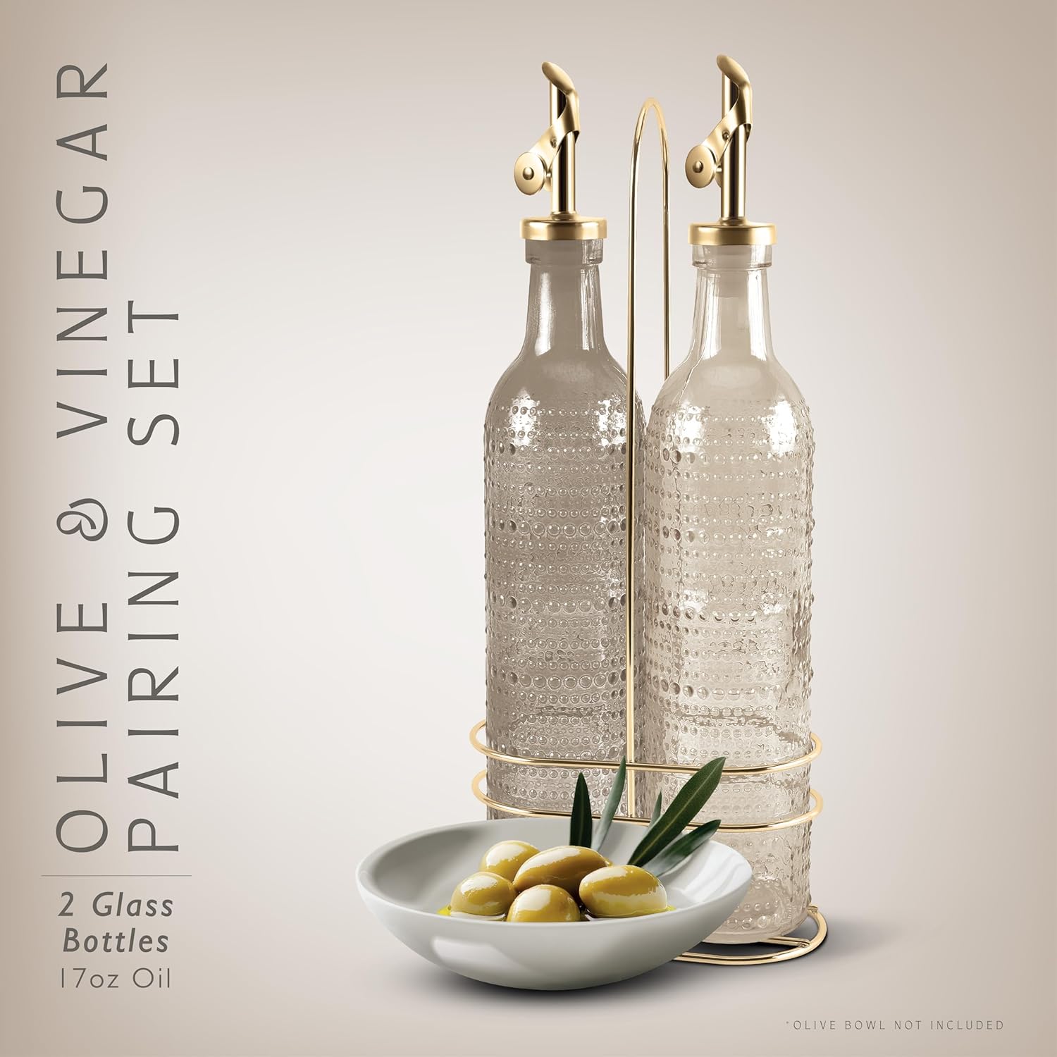 - Beautiful and Functional - Our colored glass oil dispensing bottles, with elegeant colors, gold tops and gold wire rack, will elevate your kitchen. Don't use just any oil bottle, upgrade the way you cook. That's our mission.