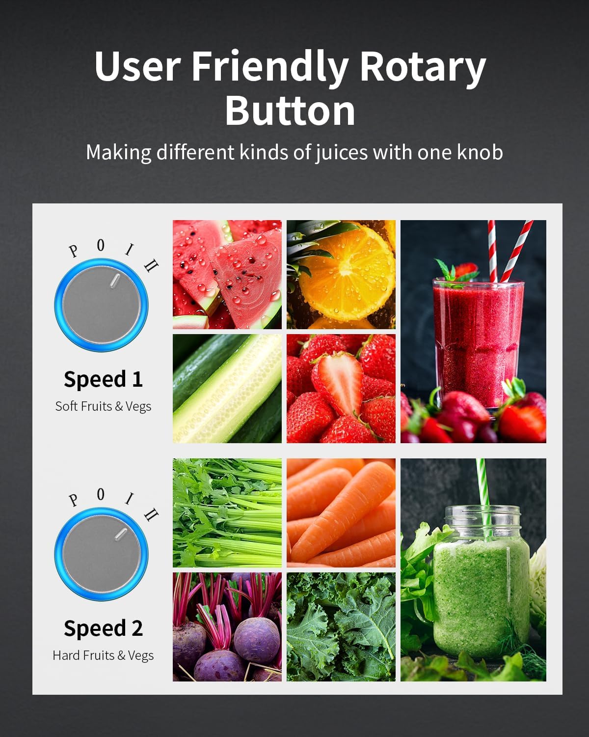 - 【3 Speeds System】- The fruit and vegetable juicer with 3 speeds system offers an efficient and convenient way to extract juice from a variety of fruits and vegetables, while retaining as many nutrients as possible. "Ⅰ low speed is for soft fruits like oranges, tomatoes and others; "Ⅱ" fast speed is for hard fruits like apple, celery, carrot, kale and others. "P" is the highest speed. (Reach maximum speed after release)