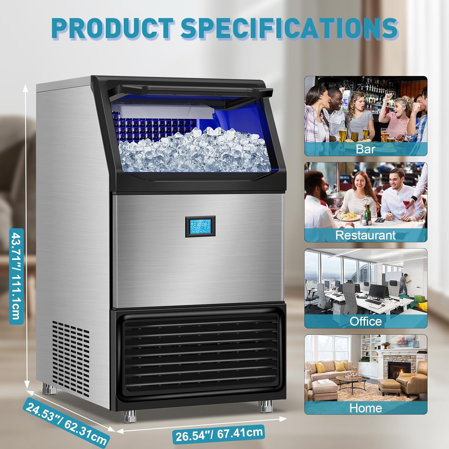 - 【INTELLIGENT CONTROL PANEL】- The ice machine is equipped with a smart LCD panel, which possesses multiple functions, including self-cleaning, defrosting, time reservation, adding water indicator, ice full indicator, lack of water protection function, intelligent temperature control, malfunction reminders (indicators), etc. The ice-making time and ice thickness of the ice cubes can be adjusted by pressing the (+) or (-) buttons. (NOTE: Keep the ice machine upright for 24h before first use.)