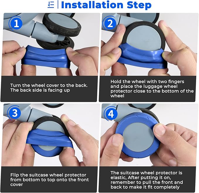- [Fits Most Suitcases] These suitcase covers for luggage wheel are suitable for suitcases with wheel diameter between 2.0-2.4"(50-60mm),the distance between the luggage wheel and wheel base fender should be more than 0.07"(1.8mm),and the distance between the luggage wheel and axle should be more than 0.05"(1.2mm) ,This Suitcase wheel cover for luggage Suitable for 4x2 double wheels, not suitable for 4x1 single wheels luggage