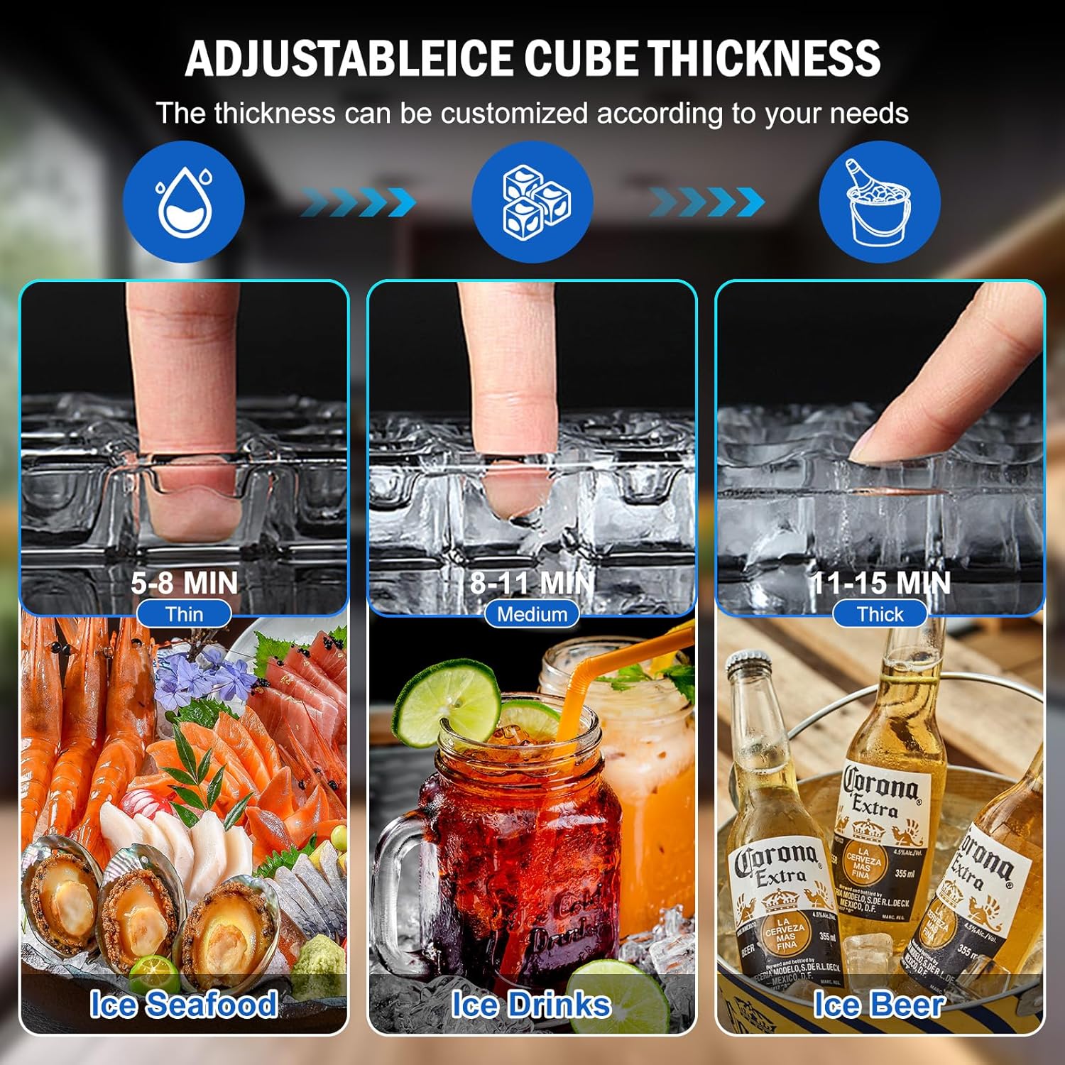 - 120 LBS/24H HIGH ICE PRODUCTION & 20 LBS STORAGE: This commercial ice maker machine produces up to 120 lbs of ice per day, creating 40 ice cubes every 8–15 minutes. You can also adjust the ice thickness by changing the ice-making time. The built-in storage bin holds up to 20 lbs of ice, easily meeting high demand and providing enough for over 500 cups of iced drinks. Perfect for restaurants, bars, hotels, and home parties.