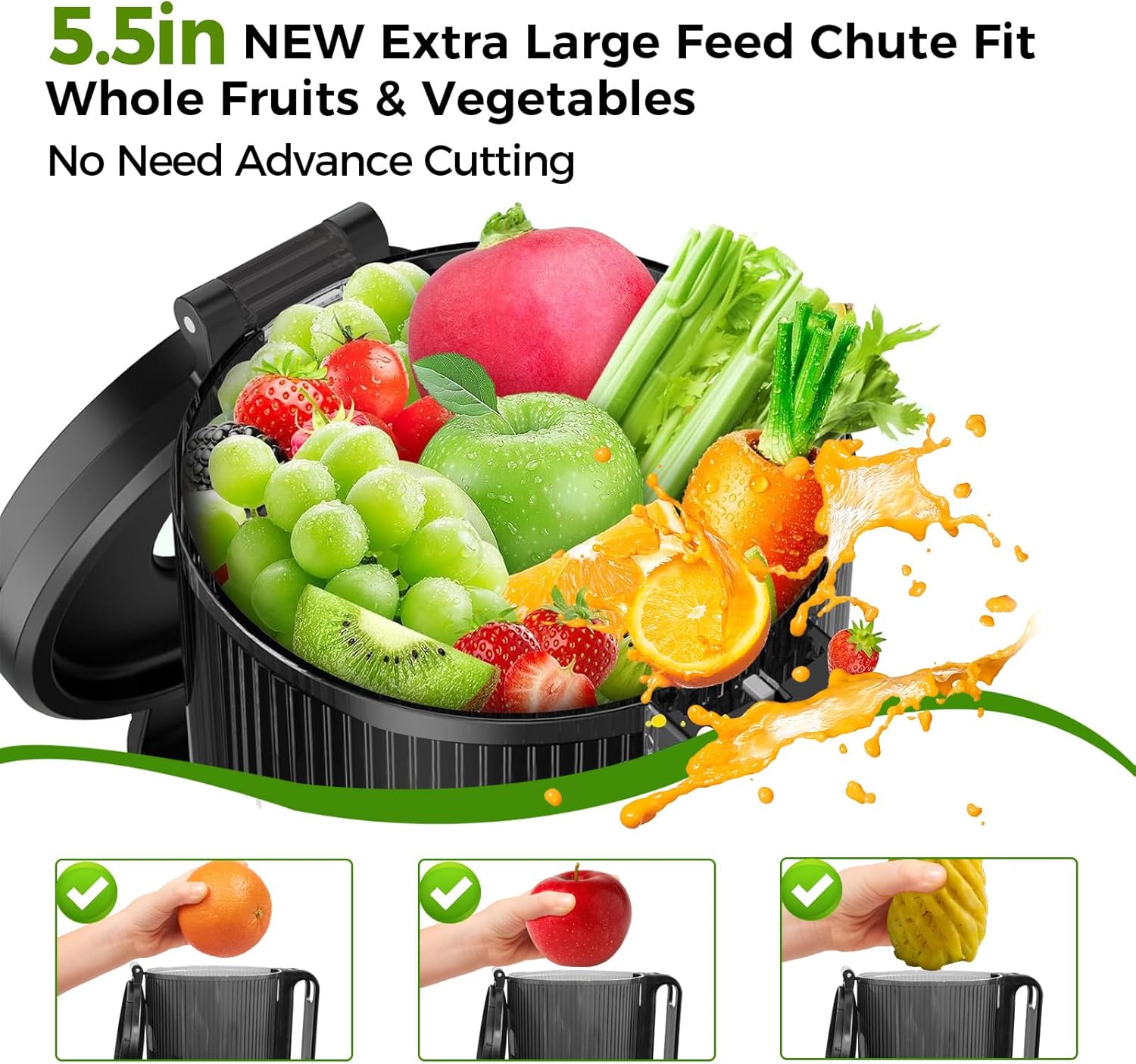 - 【Juicer Machines for Whole Fruits and Vegetables】: Our Cold Press Juicer Fully Upgraded 5.5-Inch Feed Chute Is More Larger Than Normal, 60oz supports whole fruit juicing, Allowing You to Add Whole-Sized Fruits and Vegetables Without Chopping Them Up. saving time and effort, Juice More with Ease.