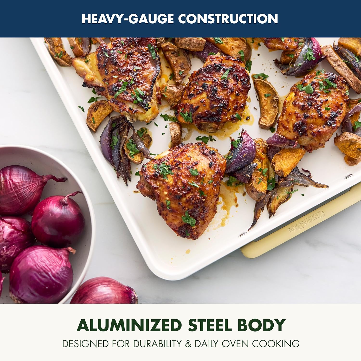 - HIGH-HEAT & EVEN HEATING – Oven and broiler safe up to 550°F, this bakeware ensures superior heat conduction for perfectly baked, roasted, and crisped results every time.