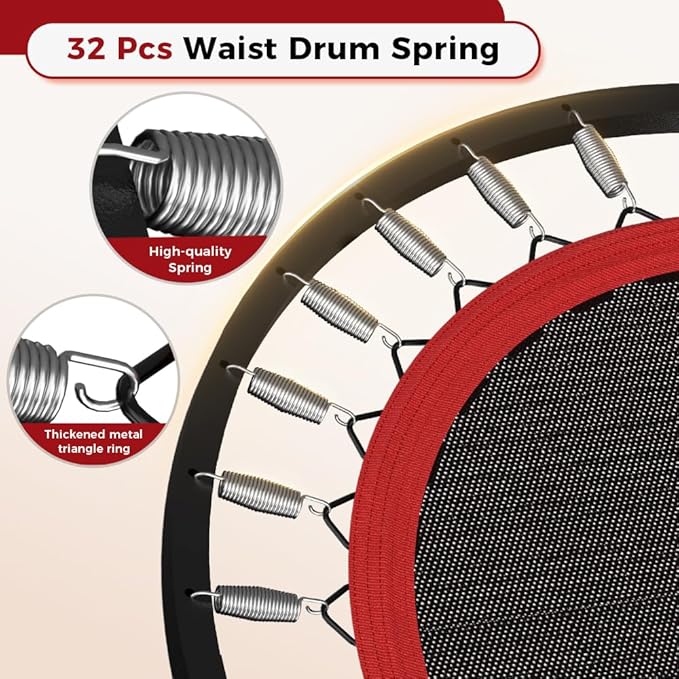 - Premium Quiet Bungees - The fitness trampoline is rigorously tested and quality inspected to hold up to 460 lbs. Equipped with 32 high-quality spring to provide adequate support and bounce to minimize impact on joints and reduce the risk of injury.The 40 inch trampoline deliver a comfortable workout experience and ensure comfort and knee/back protection.
