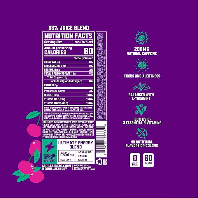 - REAL FRUIT JUICE SQUEEZED, THEN CONCENTRATED: Each sip bursts with natural flavors, using real fruit juice that’s squeezed and then concentrated for an authentic taste. With no artificial flavors or colors, clean ingredients, and only 60 calories per can, Gorilla Energy offers a light, refreshing and carbonated way to recharge.