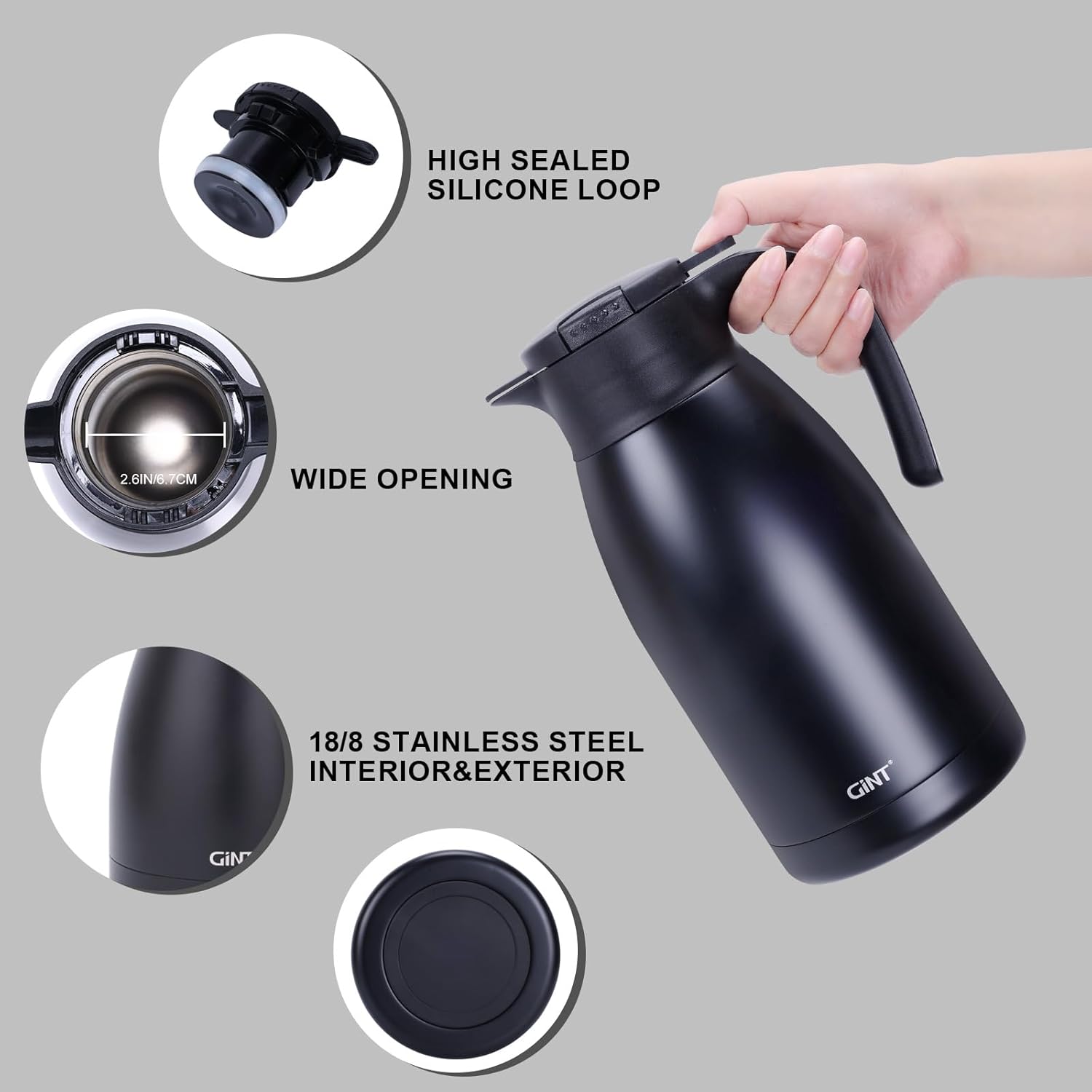 - USER FRIENDLY: GiNT 64oz thermal carafe features extra wide top opening, easy for cleaning and adding ice cubes; Simple-push button enables single-hand pouring without leaking, dripping or spilling; Ideal used for bedside, restaurant, office, party, camping, travel insulated coffee carafes.