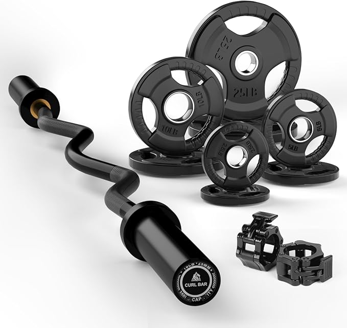 - All In One Kit to Meet Your Needs: We’re dedicated to providing convenient and effective workout solutions for all. Get this EZ curl bar and weight plate set and experience a targeted and challenging workout that activates your biceps and triceps the way they’re supposed to. Shipped in TWO packages, this set includes a black E-coated EZ curl bar and pairs of 2.5lb, 5lb,10lb and 25lb 2-inch rubber coated Olympic weight plates, all the plates totaling 85 pounds. Please notice the pair of 25lb plates is shipped separately. Barbell clips are included.
