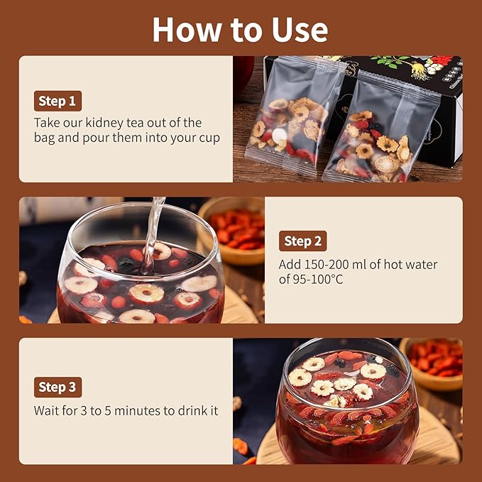 - NATURAL HERBAL FORMULA: Our te renal herbal use carefully selected ginseng, wolfberry, yam, red dates, huang jing, mulberry, maca as raw materials, after scientific proportioning, natural drying, natural formula, without any additives, you can eat the ingredients with peace of mind
