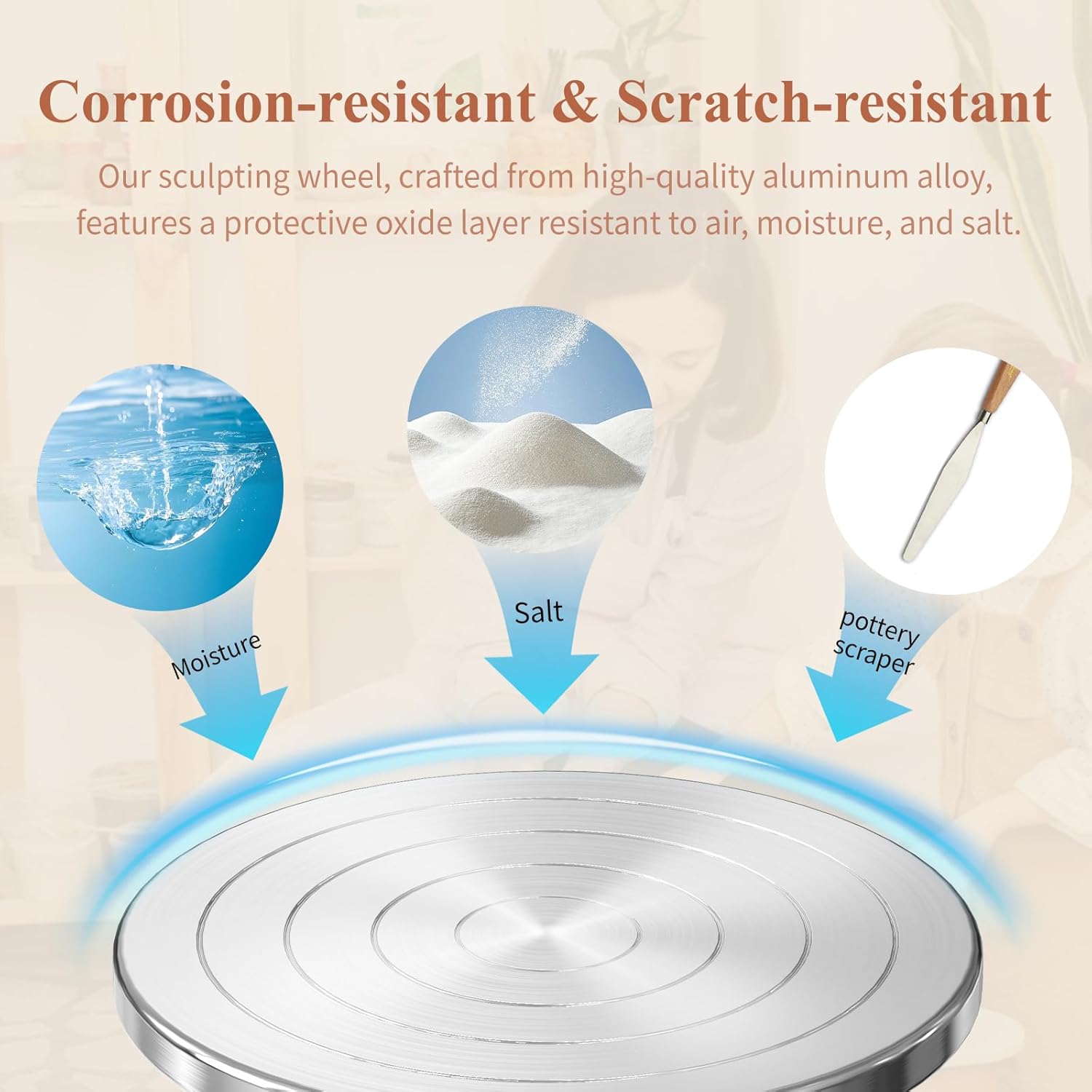 - Looking for a corrosion- and scratch-resistant pottery wheel? ——Our sculpting wheel, made from high-quality aluminum alloy, forms a protective oxide layer against air, moisture, and salt. Ideal for pottery enthusiasts and artists, it’s perfect for long-term projects.