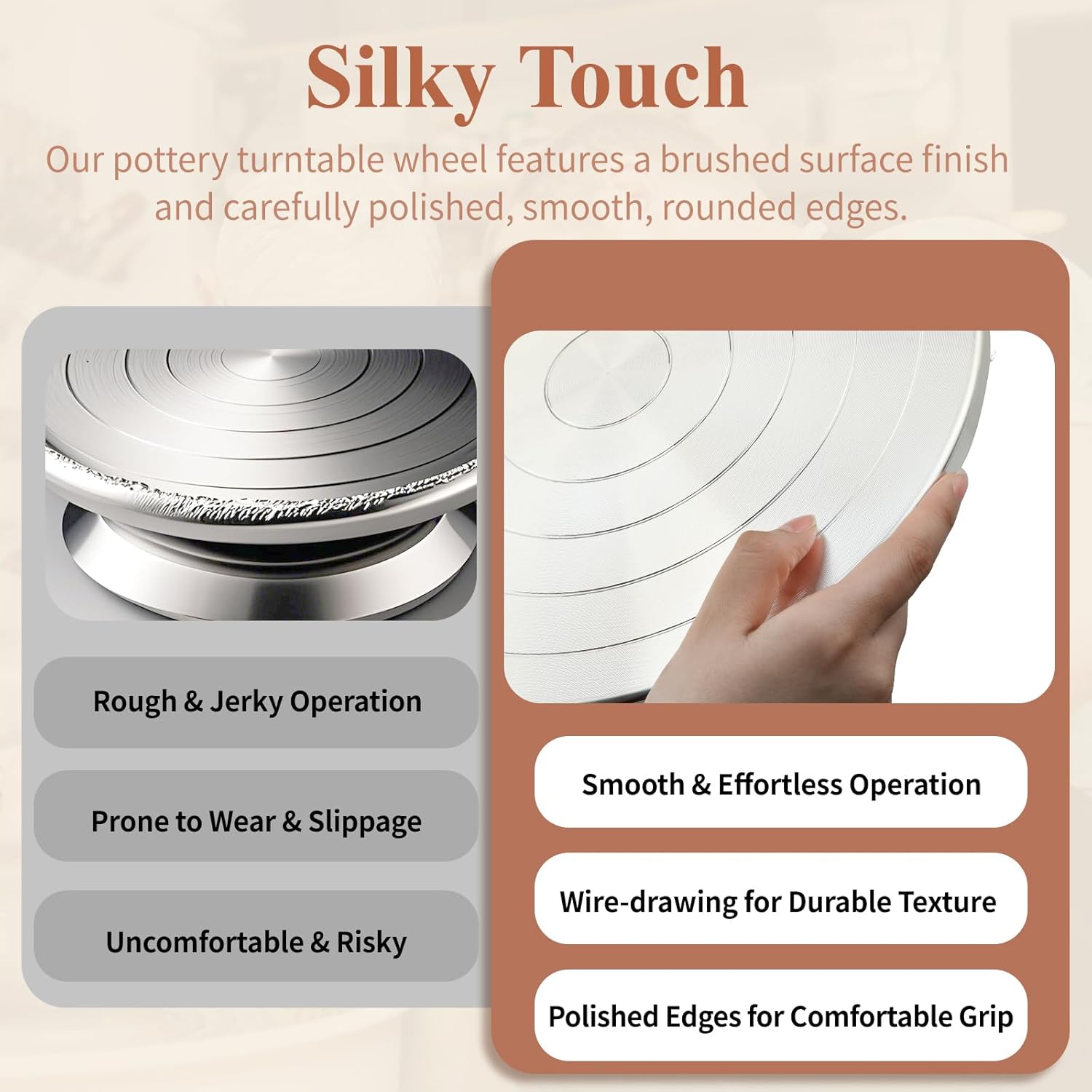 - Looking for a sculpting wheel with a smooth, high-quality touch? ——Our pottery turnable wheel features a special surface treatment with a brushed finish, and the edges are carefully polished to ensure they are smooth and rounded. Rounded edges enhance the banding wheel’s look and function, offering a refined crafting experience.