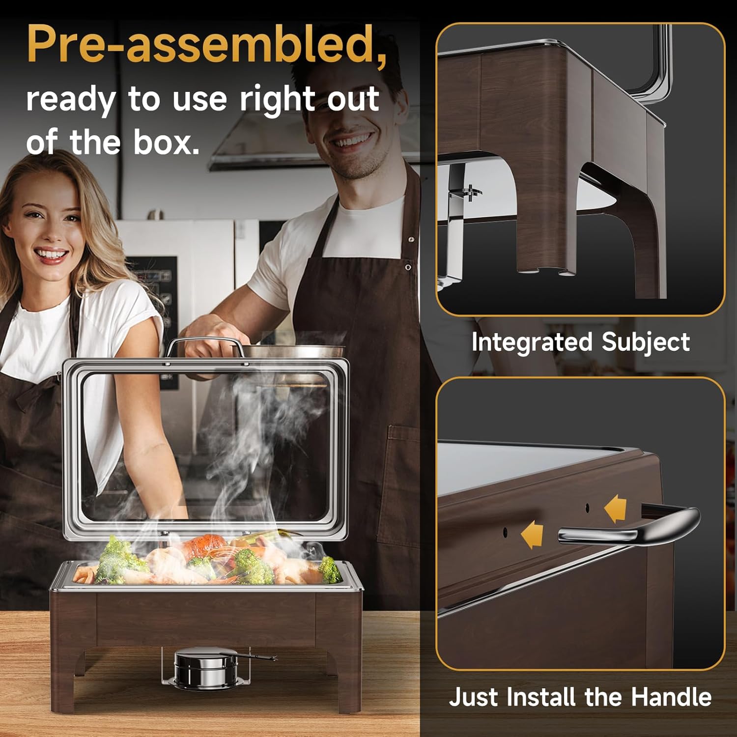 - Tool-Free Setup – Fast & Frustration-Free No complicated assembly required—just attach the handle and go. This chafing dish buffet set is designed for quick, smooth service every time.
