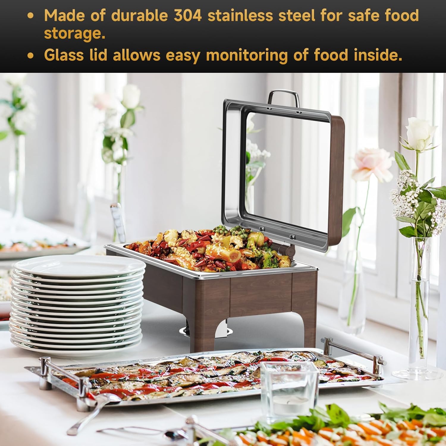 - Food-Grade 304 Stainless Steel + Water Level Indicator Durable and rust-resistant, this food warmer for parties buffet setup features a clearly marked water guide for safe heating and long-lasting use.