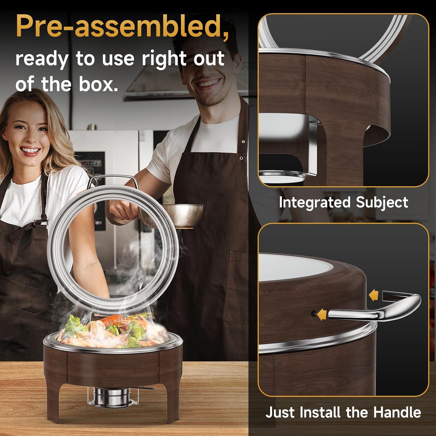 Chafing Dishes for Buffet, 6QT Round Stainless Steel Chafing Dish with Transparent Hydraulic Lid, 304 Food Pan, Buffet Warmer for Parties and Events (Wood Color)