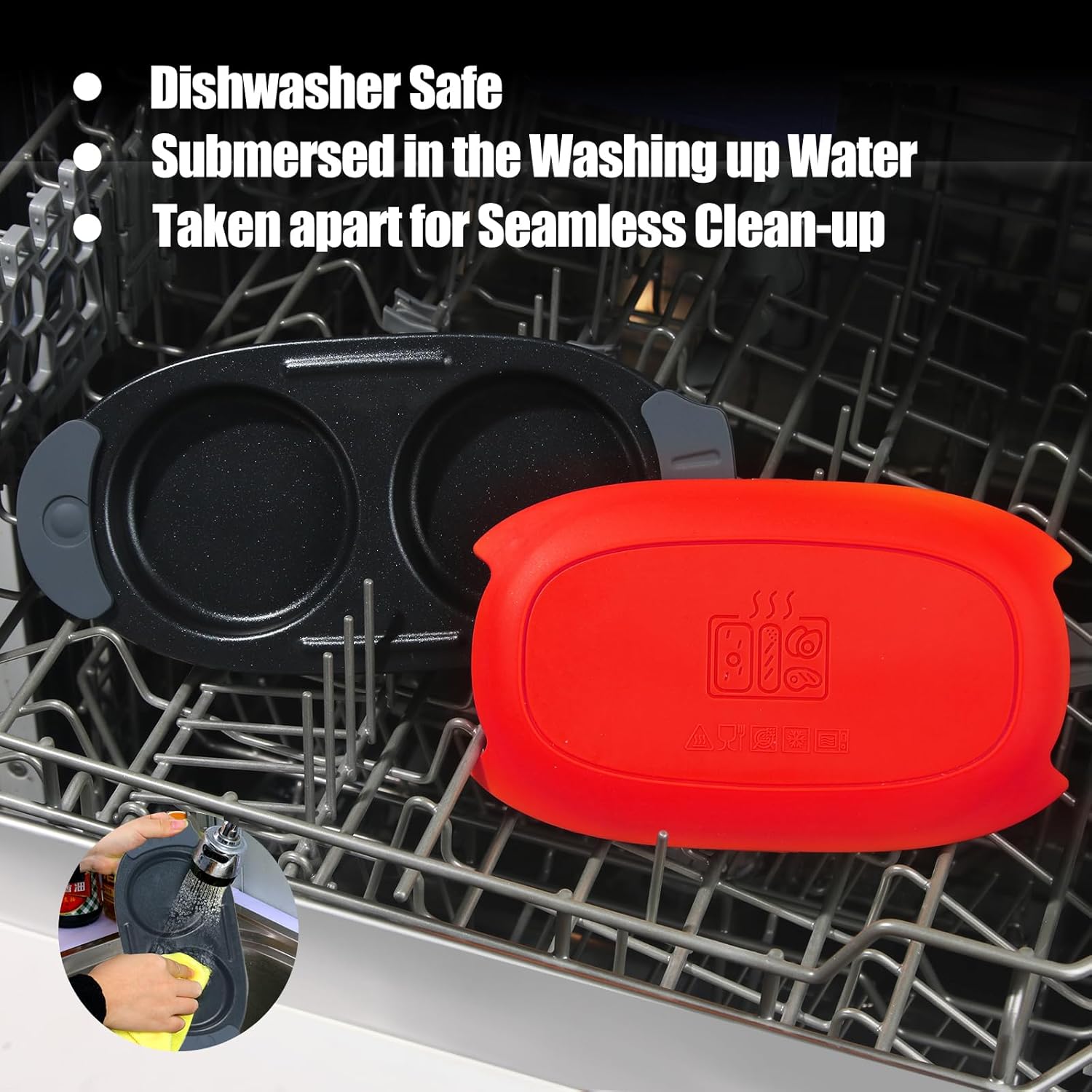 - 【EXTRA-LARGE CHAMBERS】: Dual-Zone Cooking! Fry bacon in one cavity while scrambling eggs in the other! The microwave egg maker can cook 2 sunny-side-up eggs and sausage patty in minutes for a hearty breakfast sandwich. Grill a juicy beef patty cheese on an English muffin – assemble your gourmet burger in minutes! Pro tip: Layer veggies & cheese for mini omelets! Our egg cooker for microwave can be used for fried eggs, boiled eggs, fried steak, bacon, omelettes, muffins rolls and meatloaf, rolls with chili, mushroom, vegetables, potato, shredded cheese and other side dishes. You can make it from the first start!