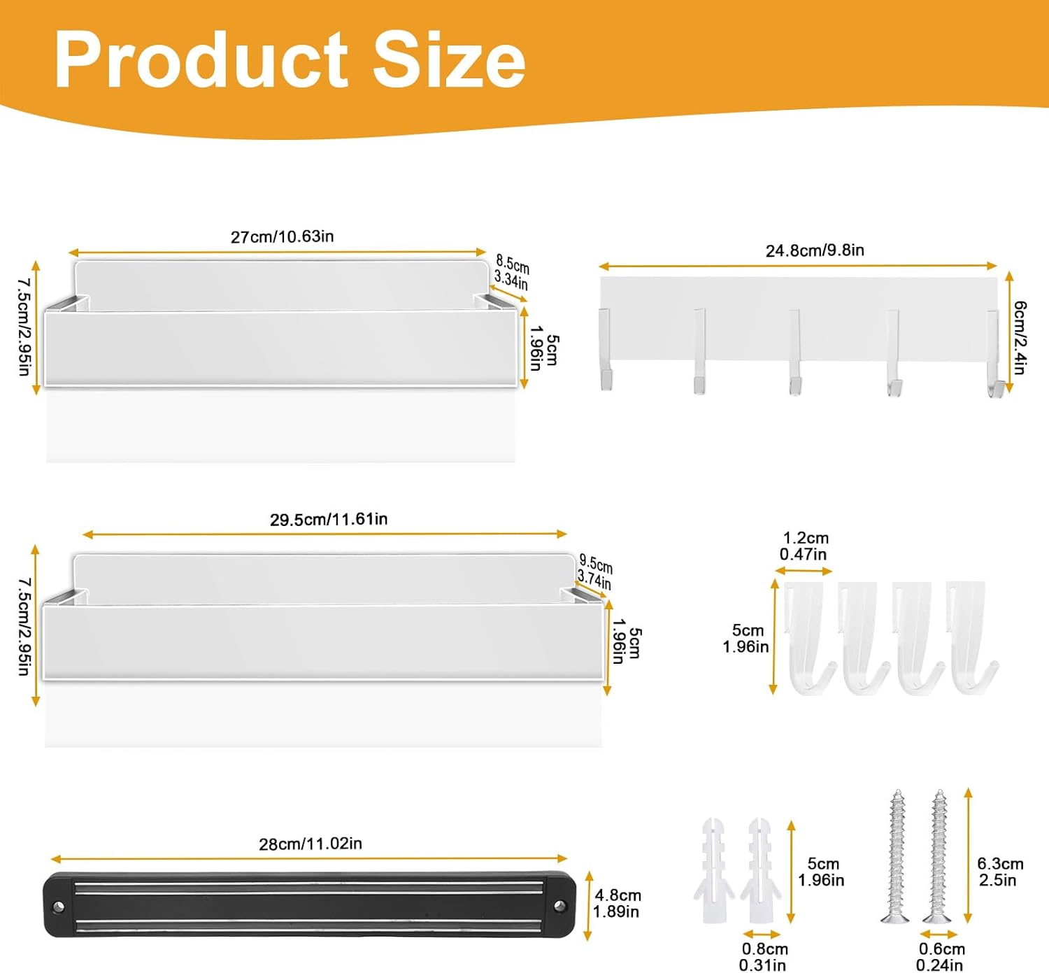 - PACKAGING:We offer 4 combination needs to meet the different items in your kitchen for categorization as well as placement needs.There are 2 colors(black,white) and 2 combinations (First,2 magnetic spice rack-large,medium,1 magnetic towel holder,1 whiteboard,3 markers-black, red, blue,4 removable hooks;Second,2 magnetic spice rack-large,medium,1 magnetic long hook, 1 magnetic knife rack, 4 removable hooks).