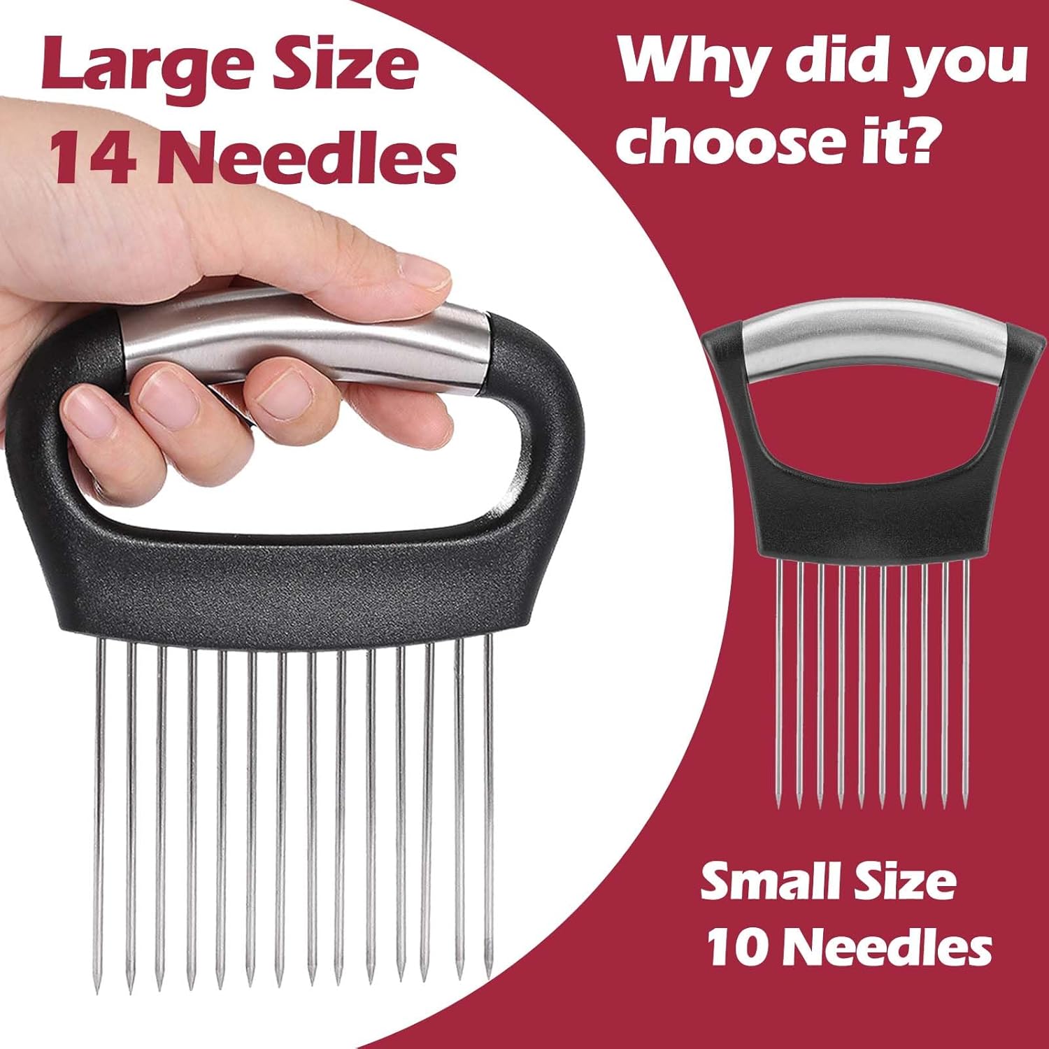 - Large Onion Slicer with 14 Long Needle: These two pieces versatile kitchen tool is a game-changer in the cooking. Its unique 14 stainless steel forks under the handle provide a comfortable grip, ensuring neat slicing of onions, tomatoes, and lemons without slippage, prevent slippage while cutting with the comfortable handle of the Onion Holder Slicer