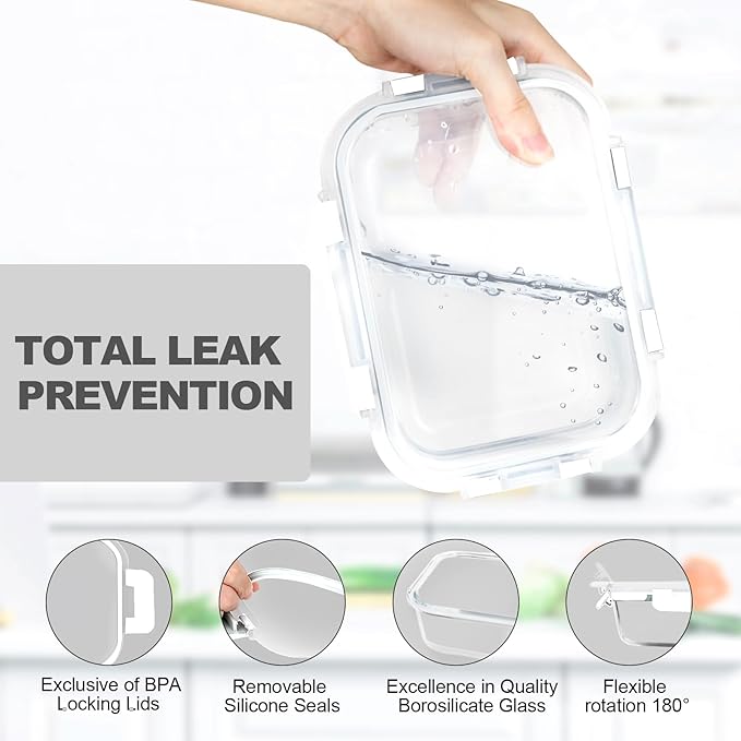 - GLASS MATERIAL EXCELLENCE IN QUALITY: Glass meal prep containers are made of superior quality borosilicate glass, for oven, microwave, dishwasher and freezer. Stronger than ordinary plastic food storage containers, food can be stored in glass containers directly after cooking. The containers are versatile to meet your everyday food storage needs, suitable for use in prep meals at home or whatever you need for the occasion.