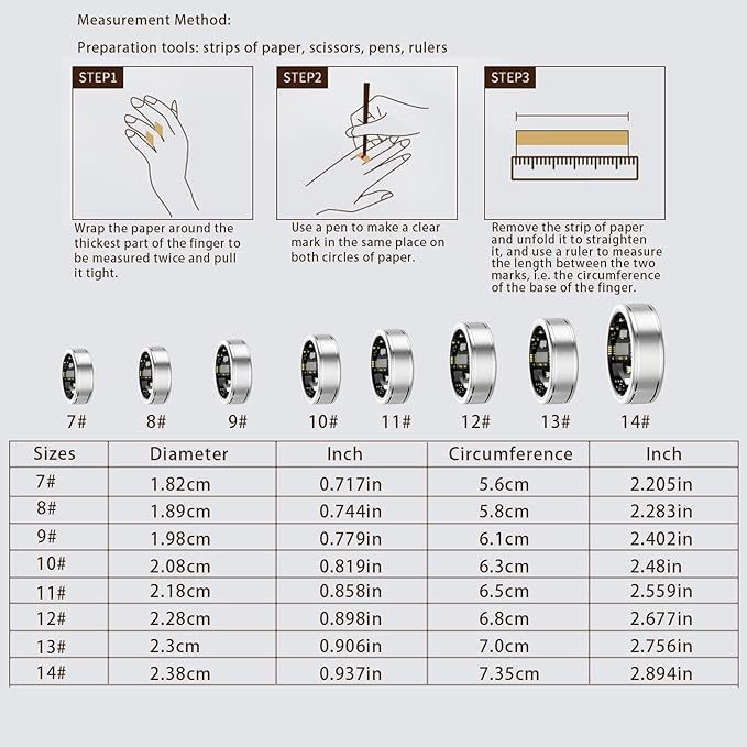 - 【Select the Right Size】: Measure your finger circumference using our size guide to ensure the best fit. The Anarow smart health ring is available in 8 sizes. If your measurement is between sizes, we recommend choosing the larger size for added comfort and accurate sensor performance