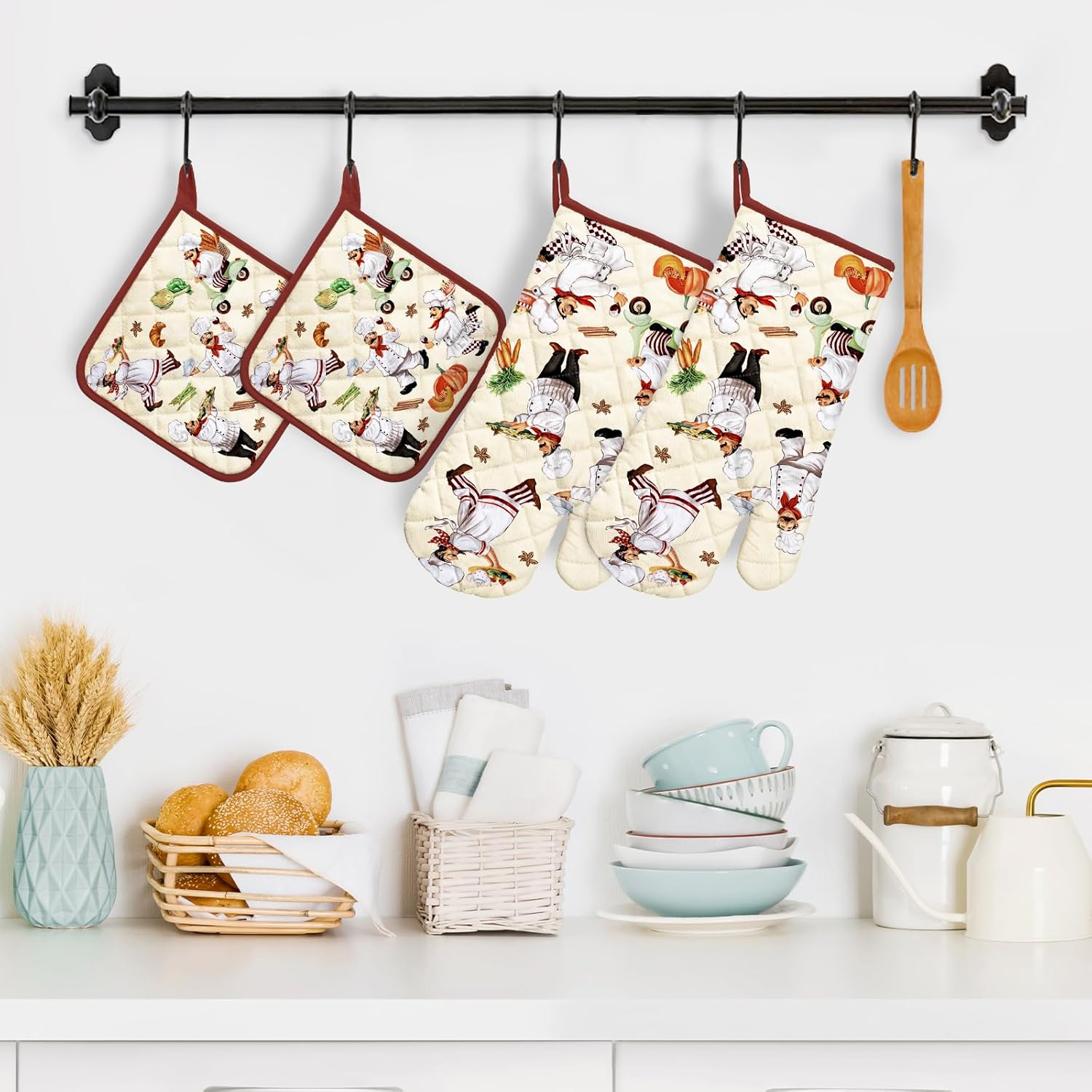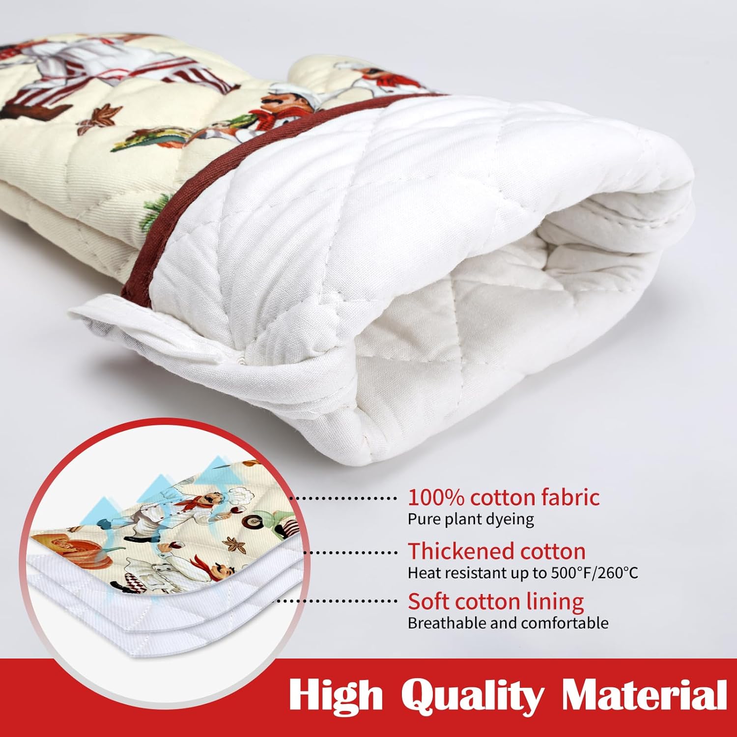 Chef Oven Mitts and Pot Holders Sets 4Pcs, 100% Cotton Heat Resistant, Extra Long Oven Gloves Potholder for Kitchen Cooking Baking Decoration