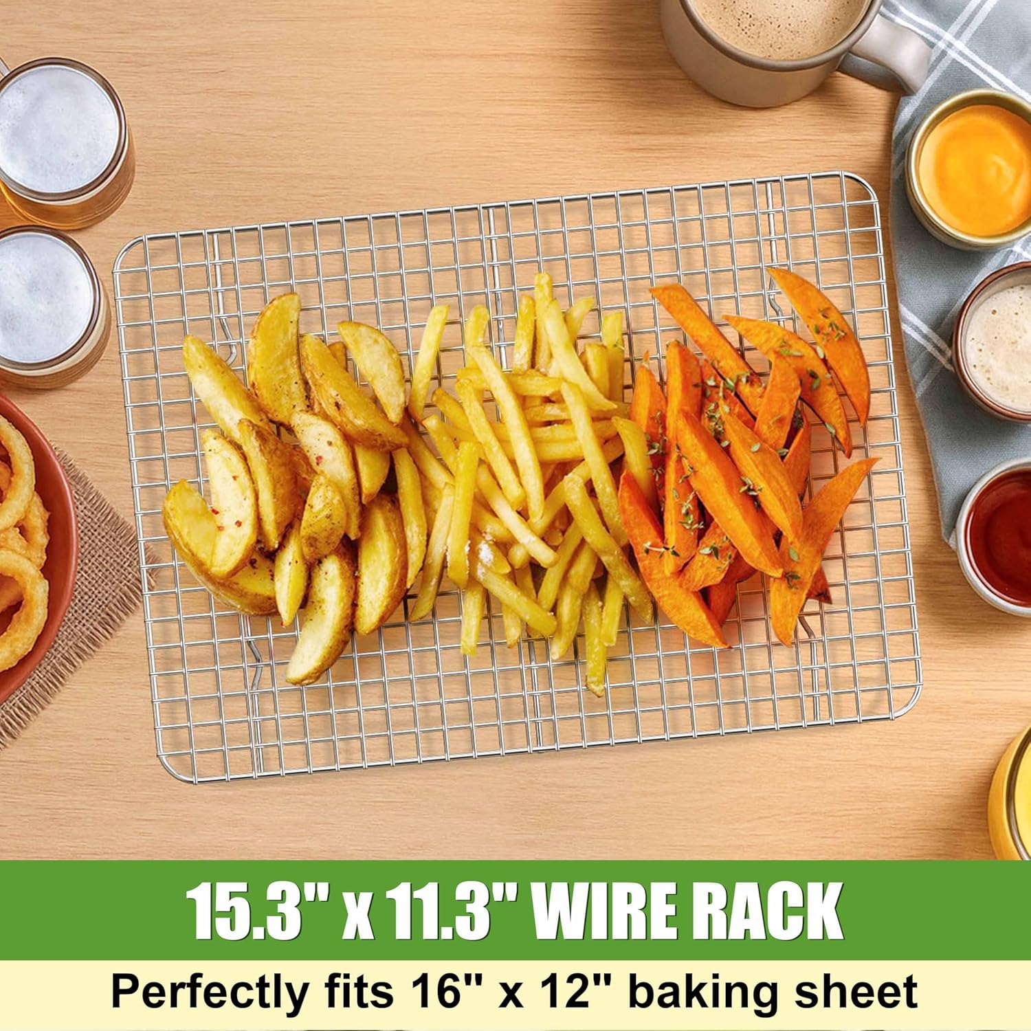 - Perfect size, 15.3" x 11.3" x 0.75" cooling racks fit perfectly inside 16" x 12" jelly roll baking pans and they can also be used separately, the cooking racks are oven safe up to 450 °F so you can bake and cool the baked foods in one rack, mirror finish for effortless food release