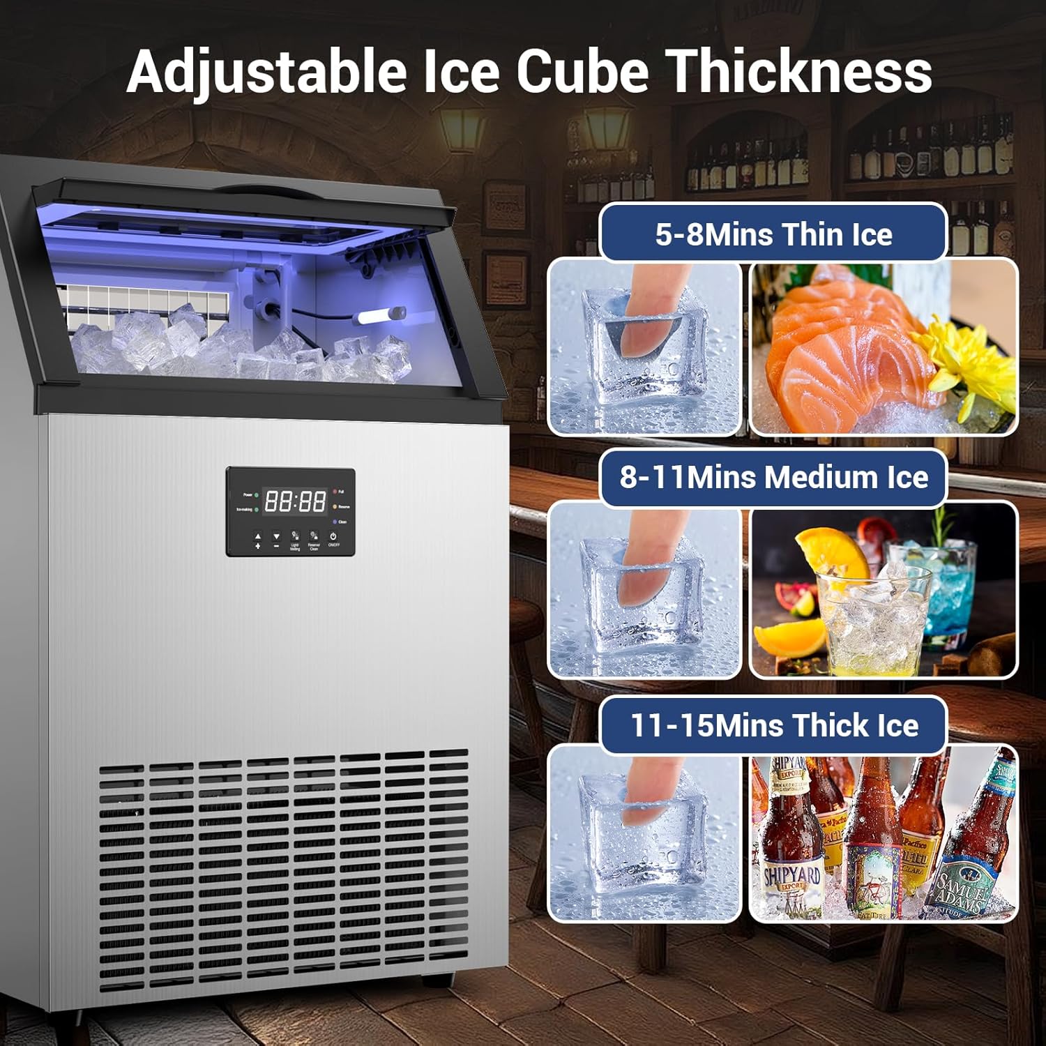 - High-Performance Ice Production: The commercial ice maker, capable of producing 165 lbs/24H, efficiently fulfills your daily ice cube requirements. This ice machine produces 55 crystal-clear cubes per cycle within just 8-15 minutes and has a 45 lbs storage capacity. If you regularly buy ice bags from stores, this machine can quickly pay for itself in under a week.