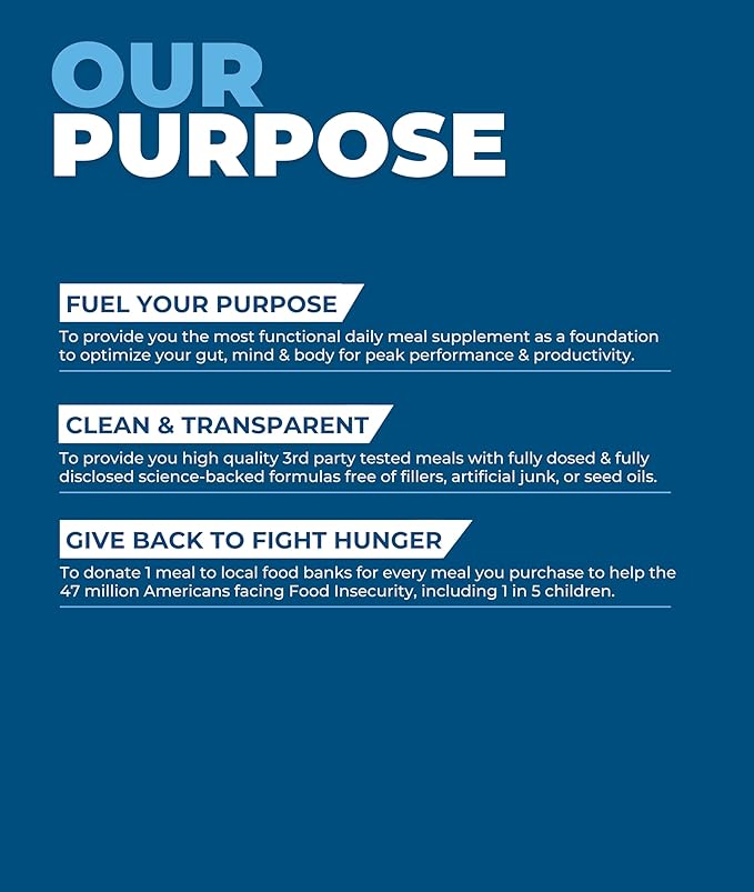 - SAVE OVER $150 A MONTH: Replace 9 Products w/ PURPOSE MEALS meal supplement including Grass Fed Whey Protein Isolate & Collagen, Creatine, Prebiotic Fiber & Postbiotics, C8 MCT Oil, Organic Mushrooms, Electrolytes Hydration, Energy Drink & Nootropic.