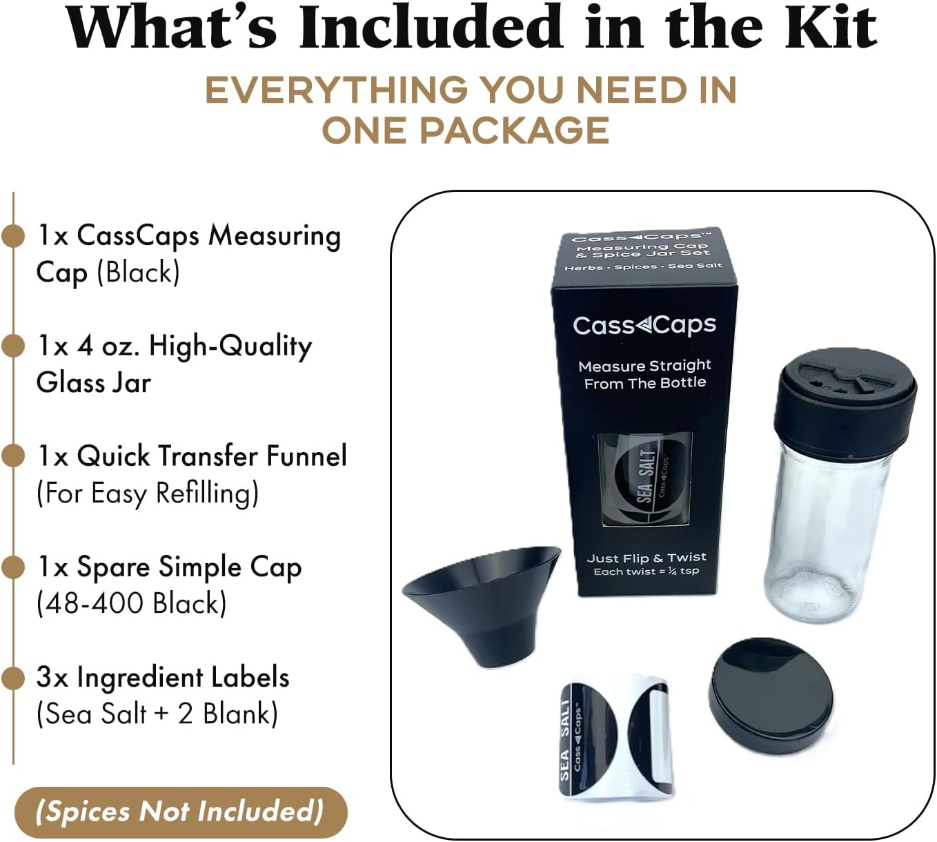 - COMPLETE KIT: Your purchase includes more than just a jar for spices & measuring cap. Itβs a complete system which includes a 4oz spice jar with lid, CassCaps measuring cap, quick-transfer funnel, plus (2) blank and (1) preprinted (sea salt) labels. This spice storage container kit provides you with everything you need to store, measure, or just sprinkle to taste your favorite spice without hassle or mess in just seconds