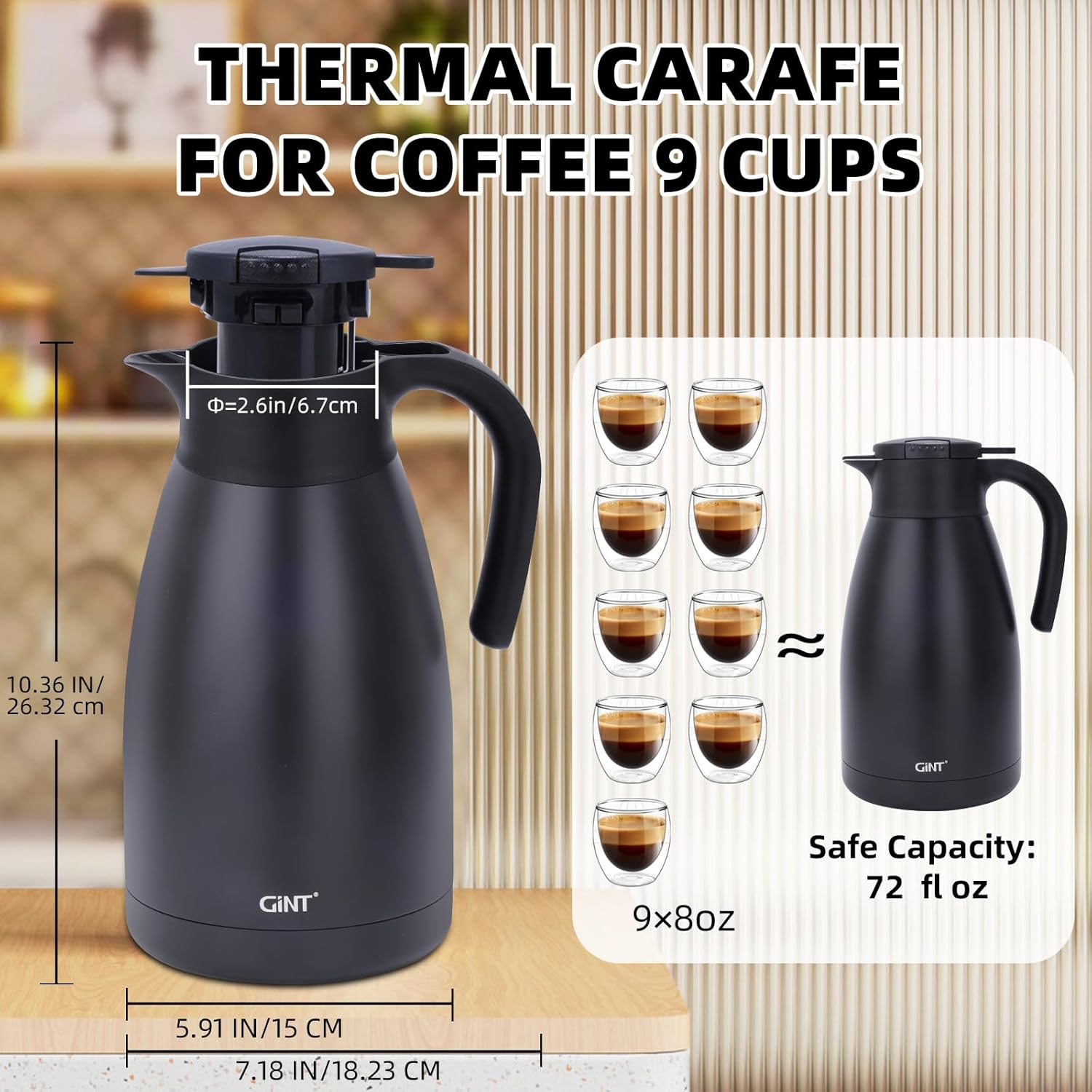 - USER FRIENDLY: GiNT 74oz thermal carafe features extra wide top opening, easy for cleaning and adding ice cubes; Simple-push button enables single-hand pouring without leaking, dripping or spilling; Ideal used for bedside, restaurant, office, party, camping, travel insulated coffee carafes.