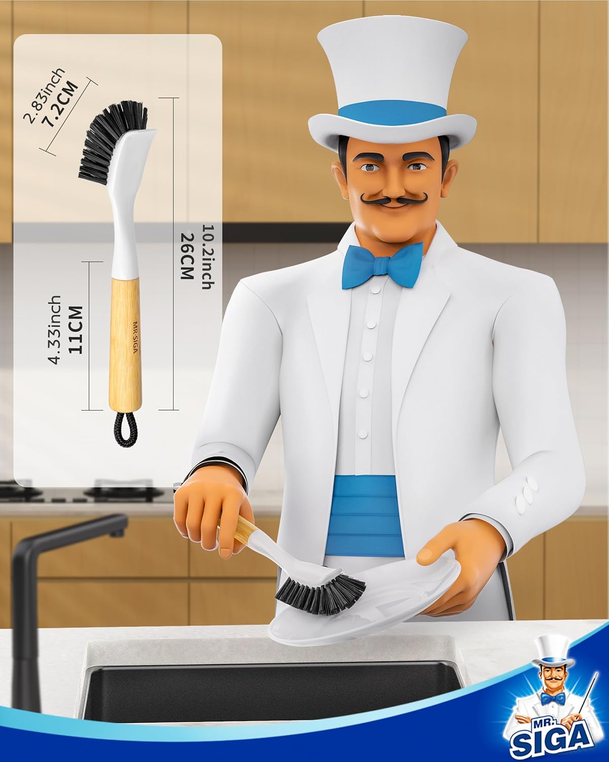 MR.SIGA Dish Brush with Handle, Dish Scrub Brush, Bamboo Dish Brush, Safe on Nonstick Pots, Pans, 2 Pack