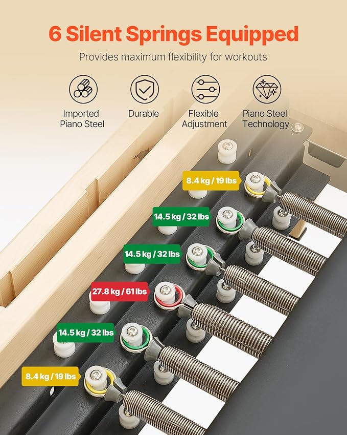 - Premium Springs: This home workout pilates equipment uses high-quality imported piano steel spring, providing 6 levels of spring resistance to target your upper body, lower body, and core muscles. The set includes 1 strong spring (red), 3 medium springs (green), and 2 light springs (yellow)