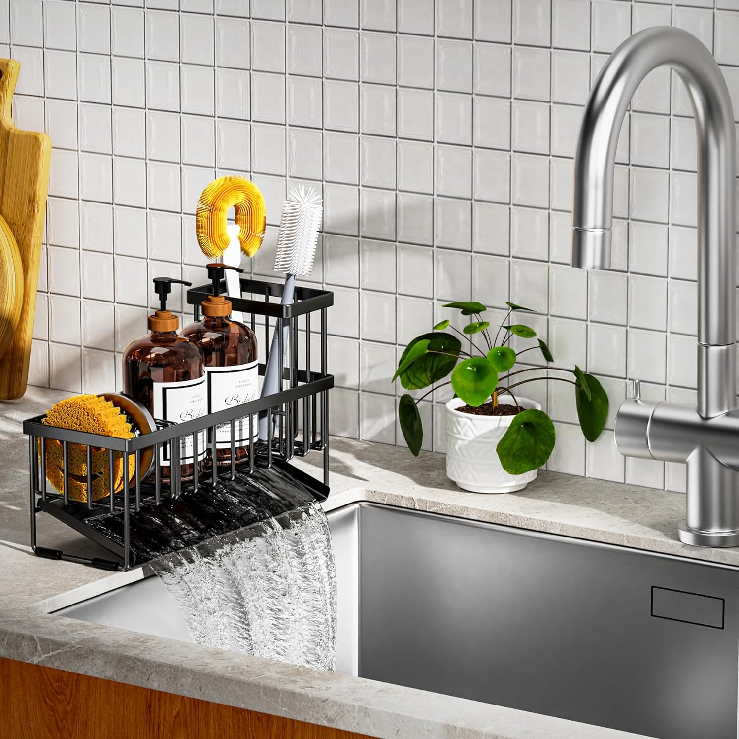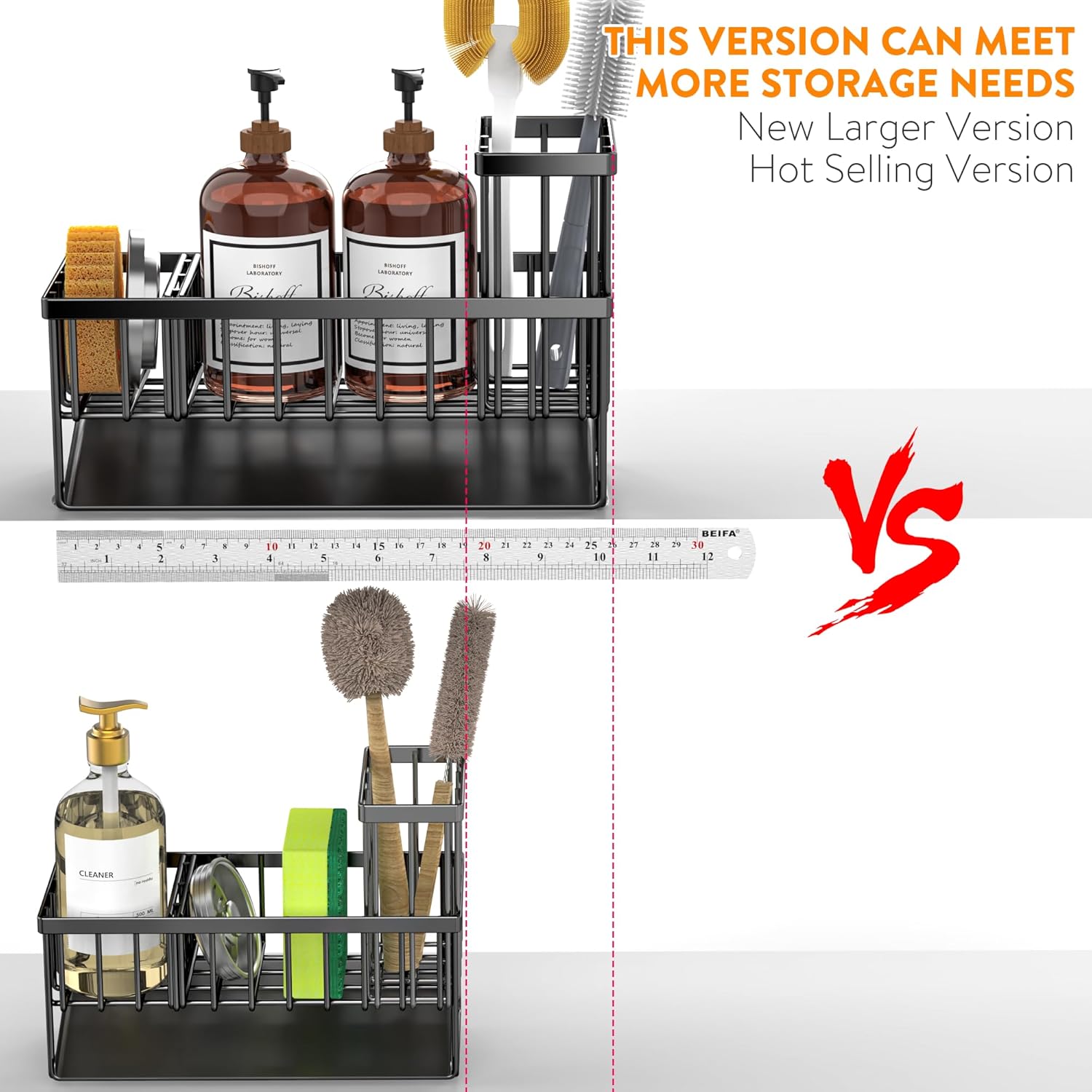 - 【EXTENDED AND LARGER CAPACITY】Cisily sponge holder has upgraded size. The size is only 10.62 inches * 3.97 inches * 6.37 inches, which can accommodate detergent bottles, sponge balls and sink plugs. Cisily sink organizer is additionally upgraded with a brush holder, which can hold up to 4 large and small brushes, perfectly saving countertop space.