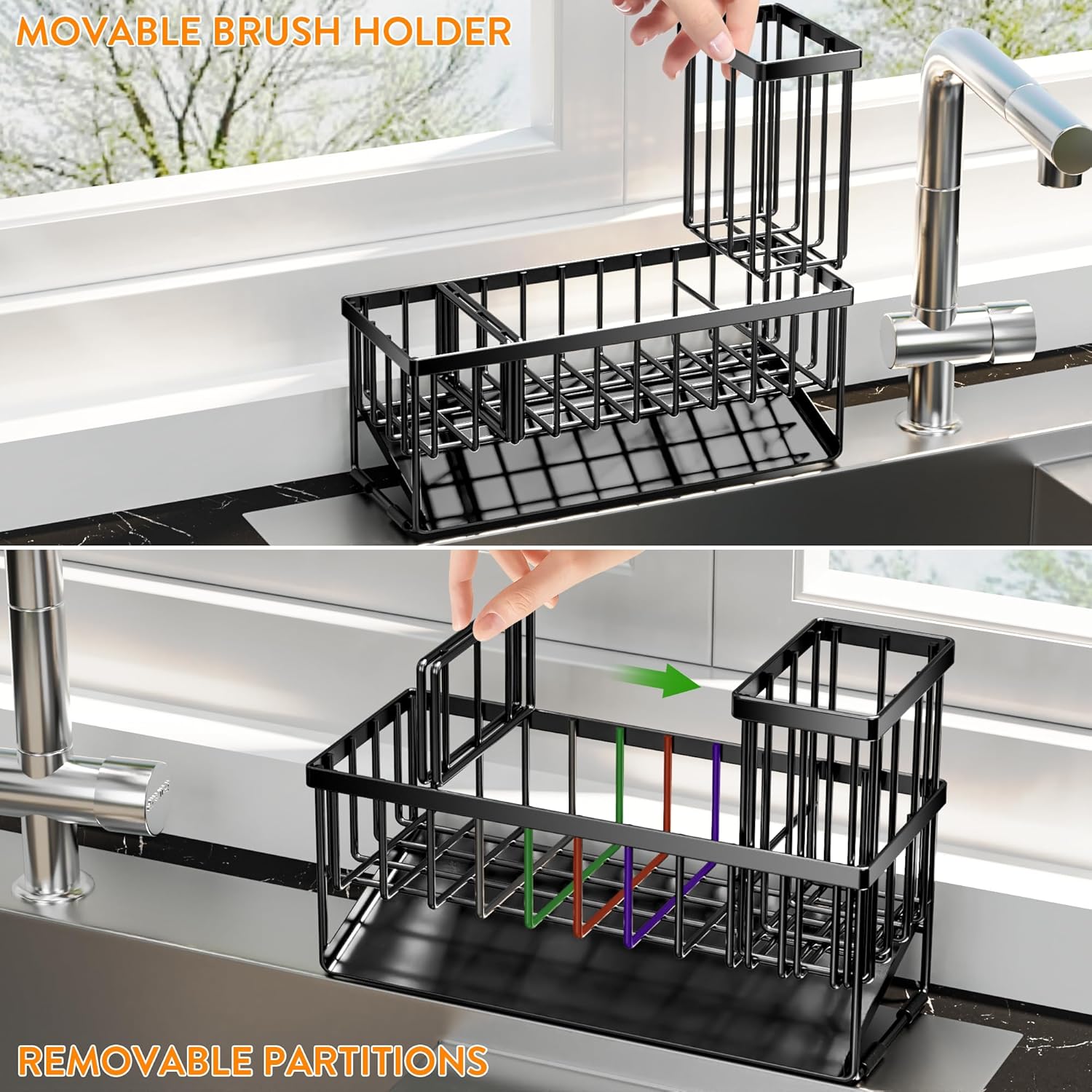 - 【REASONABLE DIVIDER DESIGN】 The sponge holder for kitchen sink ergonomic divider design allows it to have 3 separate storage spaces, Different items are placed in different areas. Make the most of every inch of space and make your kitchen look cleaner.