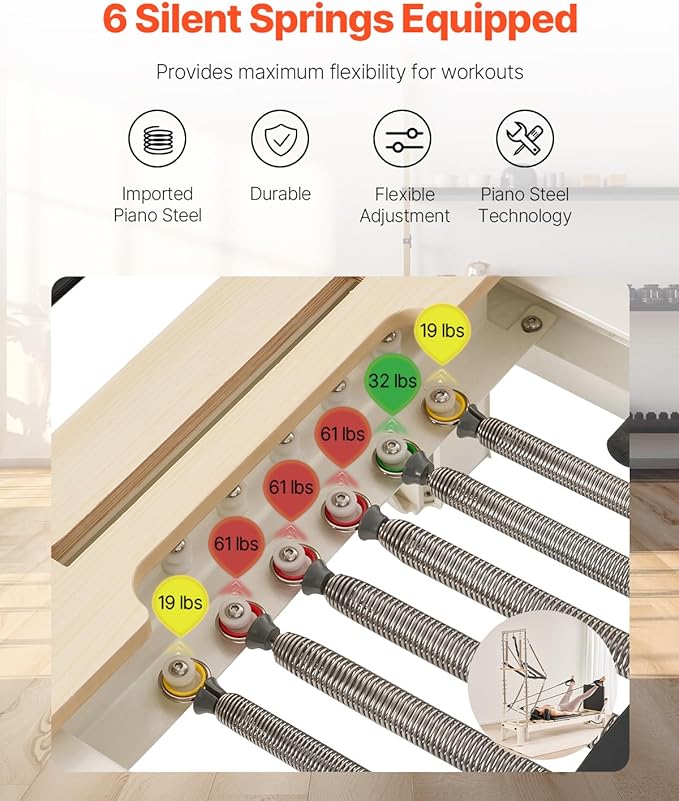 - Premium Springs: Crafted with high-quality imported piano steel spring, this home workout pilates equipment offers 6 levels of spring resistance to easily engage your upper, lower, and core muscles. The set includes 3 strong springs (red), 1 medium spring (green), and 2 light springs (yellow)