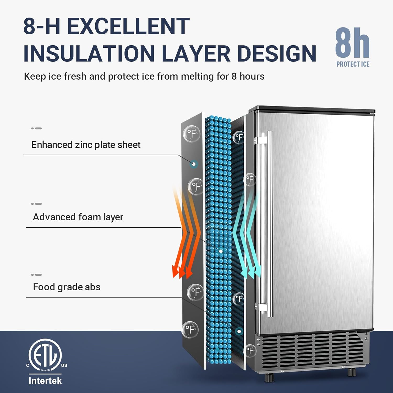- Efficient & Adjustable Ice Cubes: Equipped with an electric drain pump, this undercounter ice maker can effectively drain water without relying on gravity, helping to keep the keeping the interior clean and designed an efficient compressor and 3 layer insulation materials, the ice cubes that our under counter ice maker machine produce are clear and refresh, besides, you can also control the thickness of the ice cubes through the button to meet the need of various drinks, like smoothie/cocktail/whisky