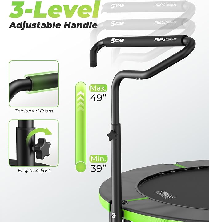 - 3-Level Adjustable Handle: Handle height available from 39'' to 49''. BCAN Rebounder Trampoline for Adults can be adjusted to the height range of the whole family, ensuring that you can hold the handlebar in the most comfortable position when jumping