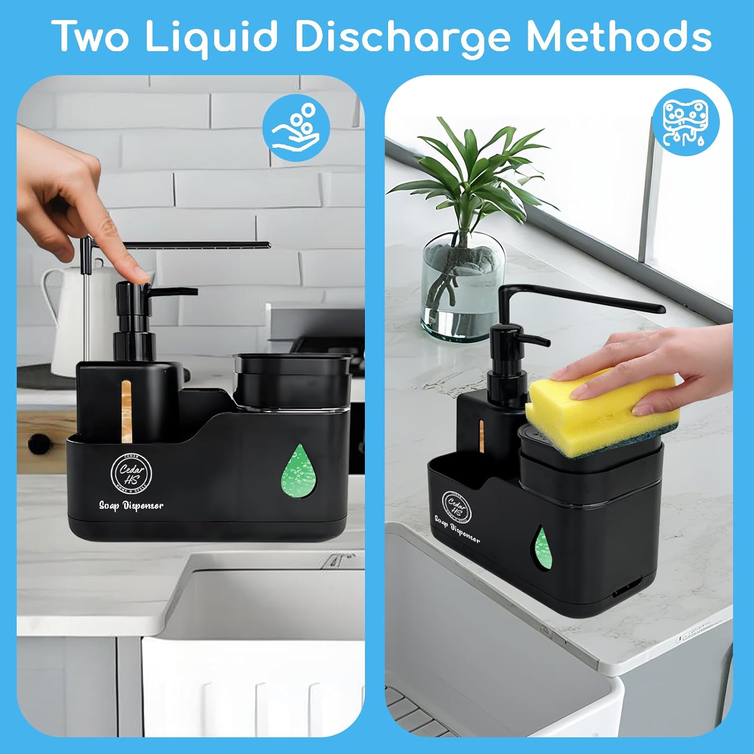 Kitchen Hand and Dish Soap Dispenser Set (Black) – Dual Pump Bottles with Sponge Caddy, Brush Holder, Towel Bar & Drain Rack – Space-Saving Countertop Organizer for Sink & Bathroom