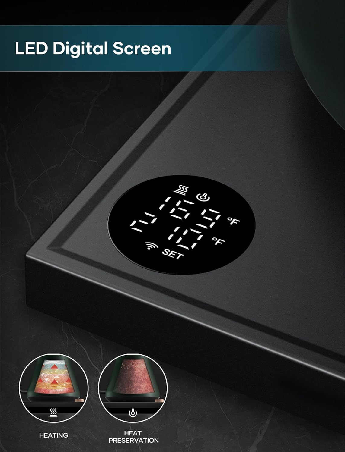 - ±1℉ Temperature Accuracy - The intelligent base's built-in temperature control program. The program will adjust the heating power when the water temp approaches the desired temp according the temp probe detects the temp change.