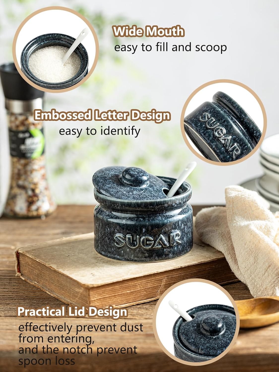 - EASY TO FILL & SERVE: The wide-mouth design makes it easier to fill and scoop out when you are making gourmet meals. This sugar dish comes with a chic spoon that helps you better control the amount of sugar you need each time. Ideal for everyday use and family gatherings. There's also a spoon notch on the lid that pairs with the sugar canister, making them a perfect combination. Not only effectively prevent dust from entering, but also prevents the lovely spoon from being lost.