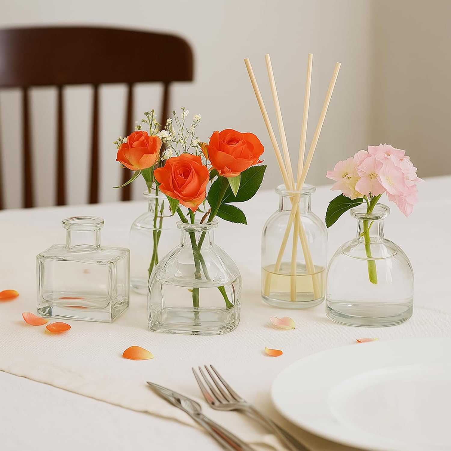 - Applicable Scenarios: Suitable for living room, dining room, store, party, bathroom, office, restaurant, bedroom, wedding and birthday, bringing you an elegant and romantic feeling. Display fresh or dried flowers, reeds, or essential oils in these mini flower vases,which are ideal for centerpieces on dining tables, shelves,or window sills.