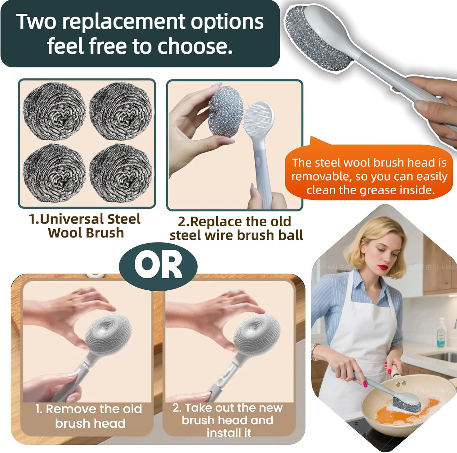 - All-in-one kitchen Dish Brush Set:Feature a replaceable heads,includes dish brush with handle of 3 pieces - steel wool, sponge and plant fiber brush - plus acompact holder. Perfect for everyday cleaning.