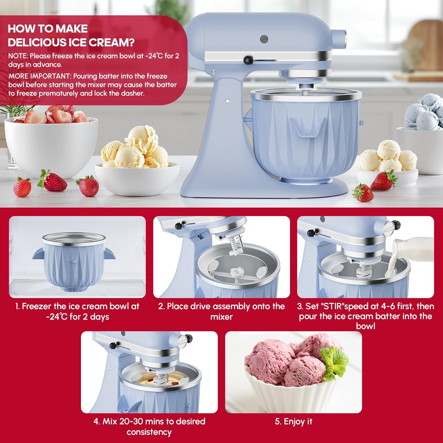 - Large Capacity: Makes up to 2.0 quarts of soft consistency ice cream, gelato or sorbet in 20-30 minutes with kitchen aid ice cream attachment, high capacity allows you to accomplish your dessert as more as possible, share delicious ice cream with your friends or family at home.