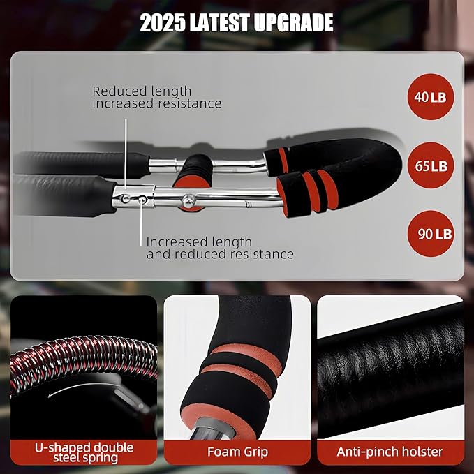 - [CHEST EXERCISER FOR MEN] Our twister arm trainer for men & women has a unique two-stage adjustment function and is equipped with 2 spring workout bars with resistance, which can form 40-100 pound four stage resistance exercise. Easily meet your diverse exercise needs. From basic warm-up, rehabilitation therapy to advanced muscle shaping, our twister arm exercise set that meets all your needs.