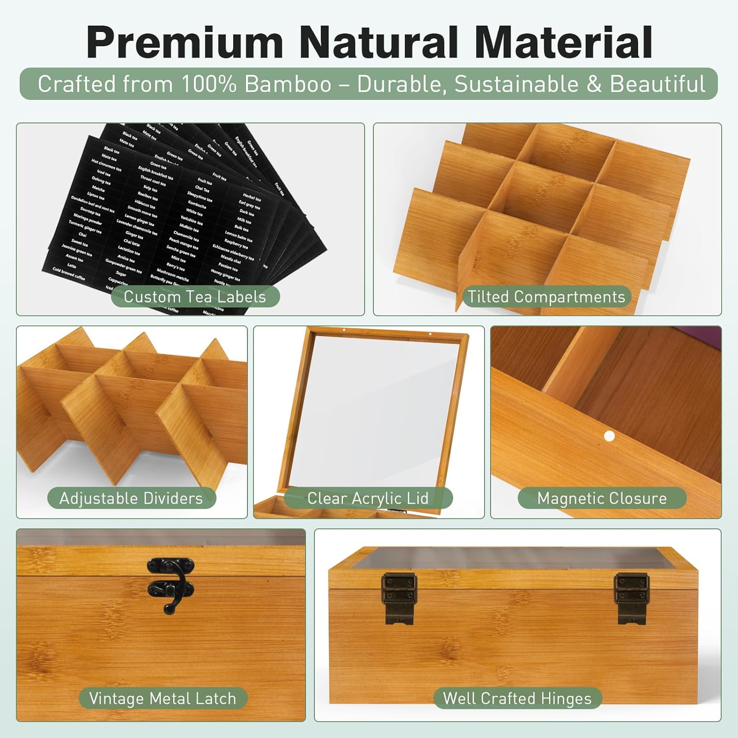 - 🍵Clear Acrylic Lid & Custom Tea Labels:The clear acrylic top lid provides a full view of your tea collection while keeping contents fresh and dust-free. Included are customized tea name labels (Green Tea, Black tea,etc.), making it easy to organize and identify your favorite blends at a glance