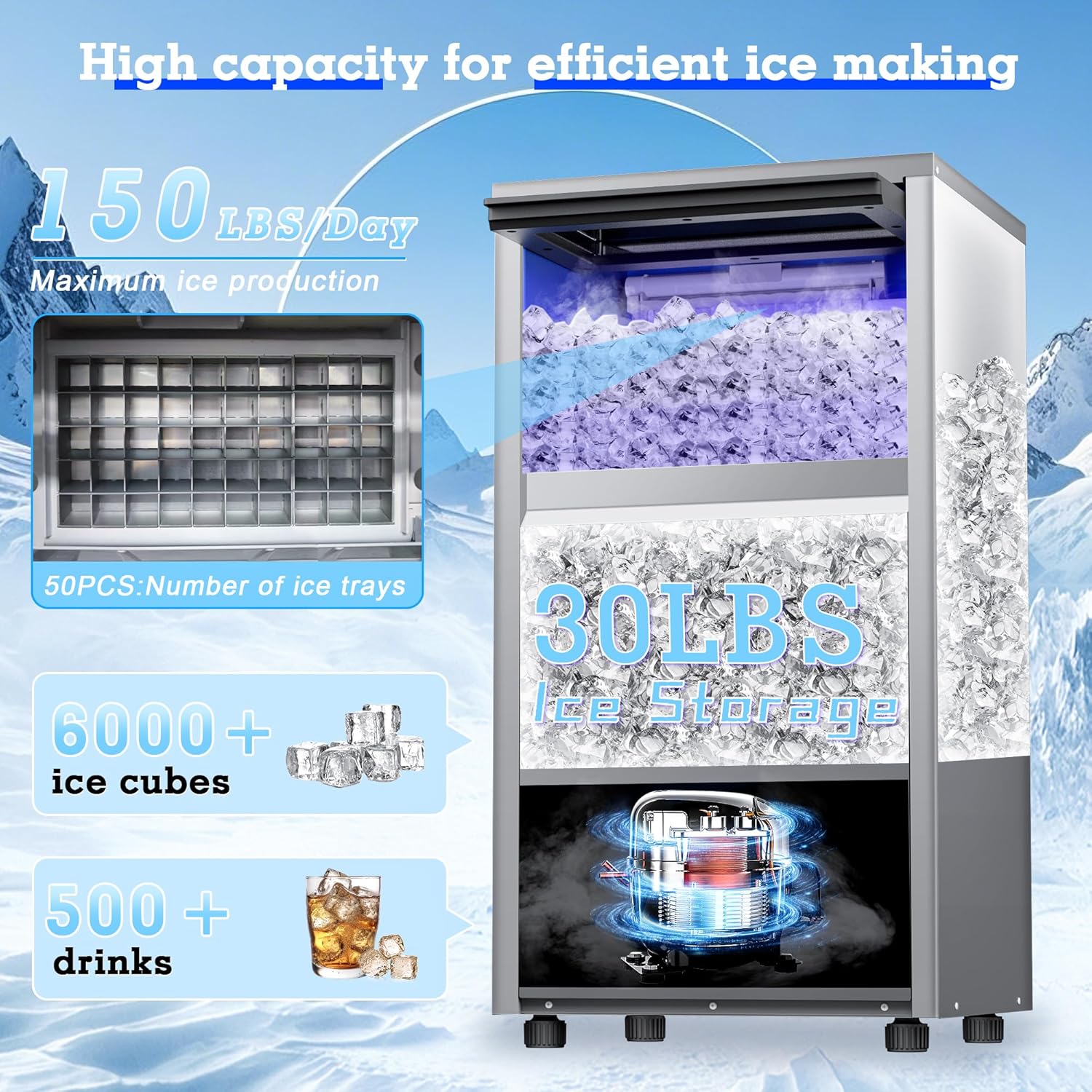 - Efficient Ice Making and Storage: Our commercial ice maker features a high-performance compressor that produces up to 150 lbs/day, 50 cubes/cycle and a storage bin that can hold up to 30 lbs. of ice to meet your ice needs, making it ideal for high-traffic venues, such as homes, restaurants and other places, so say goodbye to ice panic.