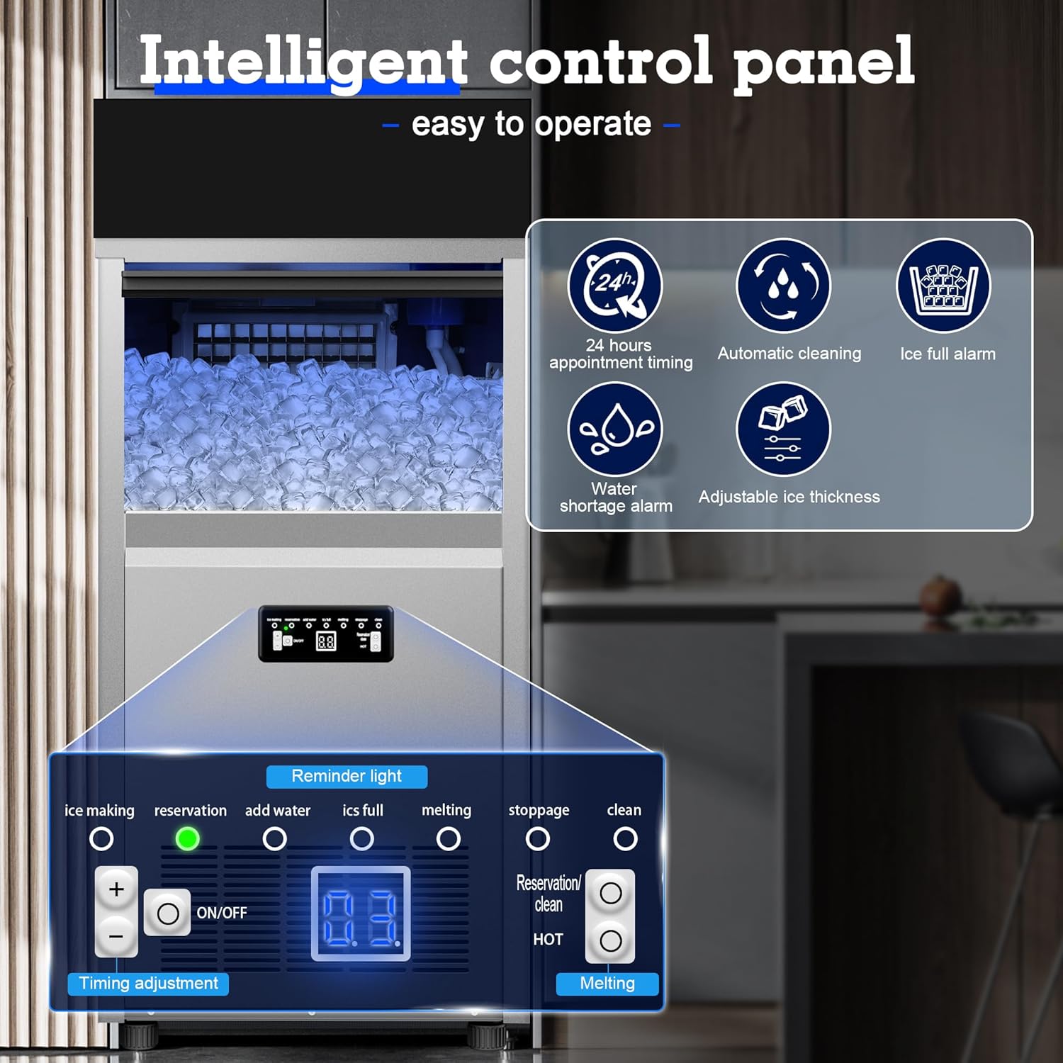 - Intelligent Control Panel: Our commercial ice machine is equipped with LED digital display and mechanical buttons for operation, adjusting the thickness of ice, 24-hour appointment timing, self-cleaning, prompt lights (ice full stop, water shortage prompt, etc.),The ice maker can be turned off or on at a time you set, making ice making easy and simple!