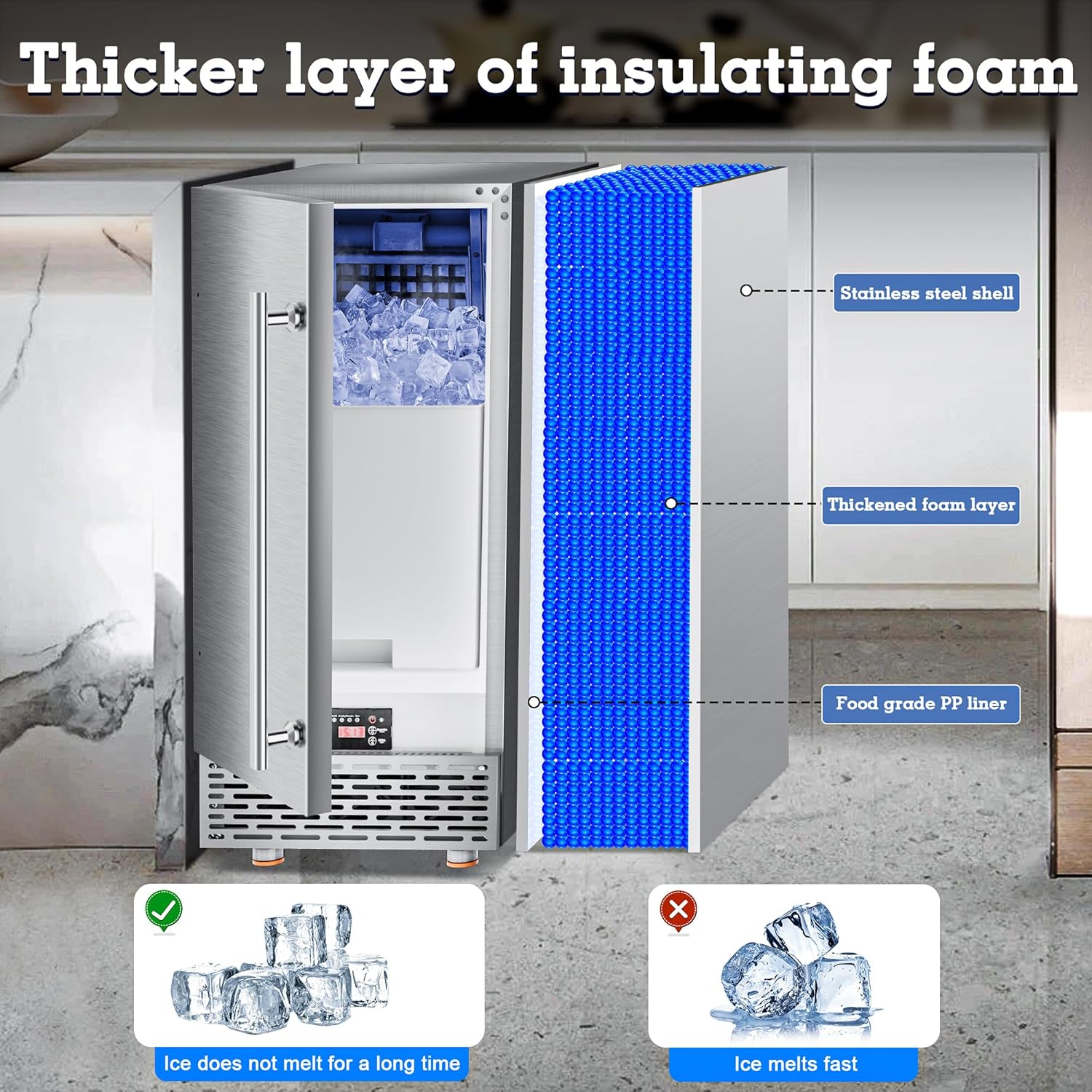 - Reversible Door Design: This freestanding ice maker features a reversible door design with a stainless steel door with reversible hinges, allowing for flexible left or right side mounting and adapting to a variety of spatial configurations to find the optimal placement in both domestic and commercial environments.Size: 15 x 18.5 x 33.78 inch.